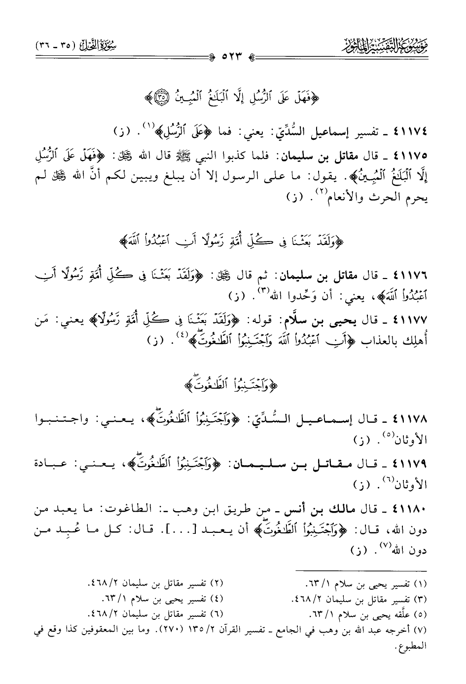 ٤١١٧٧ - قال يحيى بن سلّام: قوله: {ولقد بعثنا في كل أمة رسولا} يعني: مَن أُهلِك بالعذاب {أن اعبدوا الله واجتنبوا الطاغوت} (¬٤). (ز)