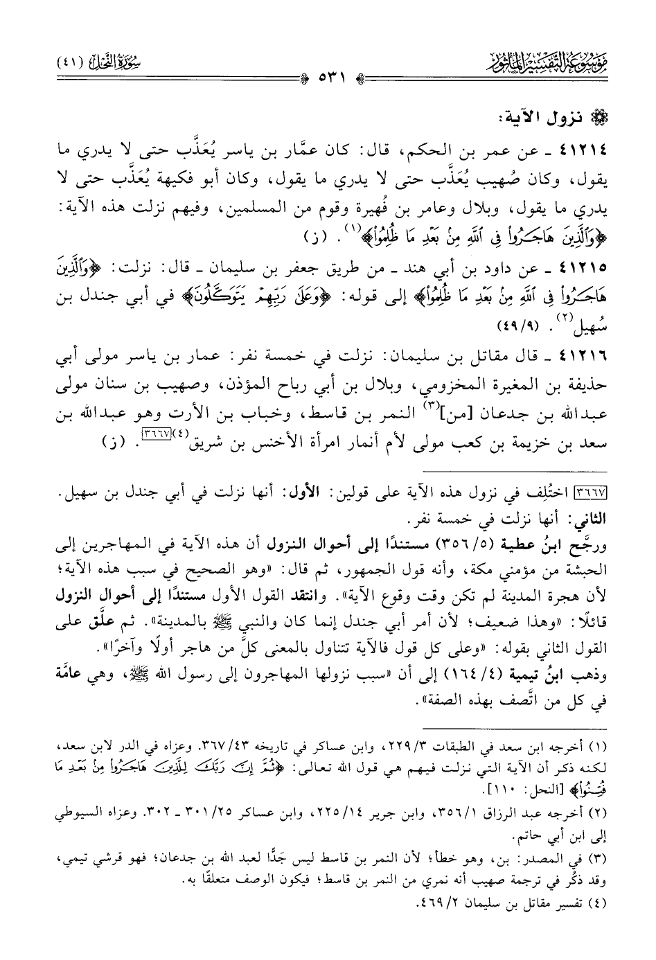 ٤١٢١٤ - عن عمر بن الحكم، قال: كان عمّار بن ياسر يُعَذَّب حتى لا يدري ما يقول، وكان صُهيب يُعَذَّب حتى لا يدري ما يقول، وكان أبو فكيهة يُعَذَّب حتى لا يدري ما يقول، وبلال وعامر بن فُهيرة وقوم من المسلمين، وفيهم نزلت هذه الآية: {والذين هاجروا في الله من بعد ما ظلموا} (¬١). (ز)