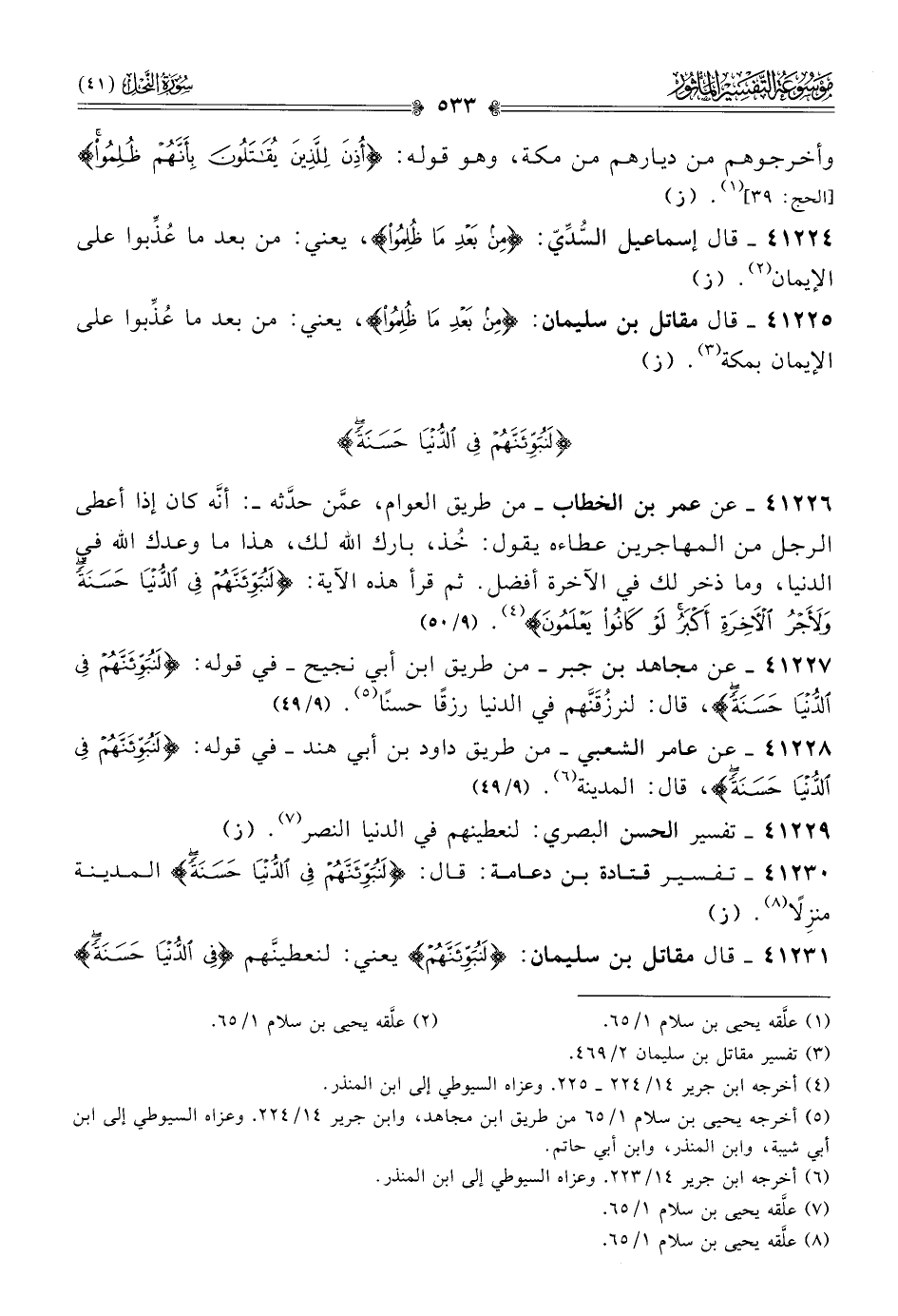 ٤١٢٢٨ - عن عامر الشعبي -من طريق داود بن أبي هند- في قوله: {لنبوّئنّهم في الدنيا حسنة}، قال: المدينة (¬٦). (٩/ ٤٩)