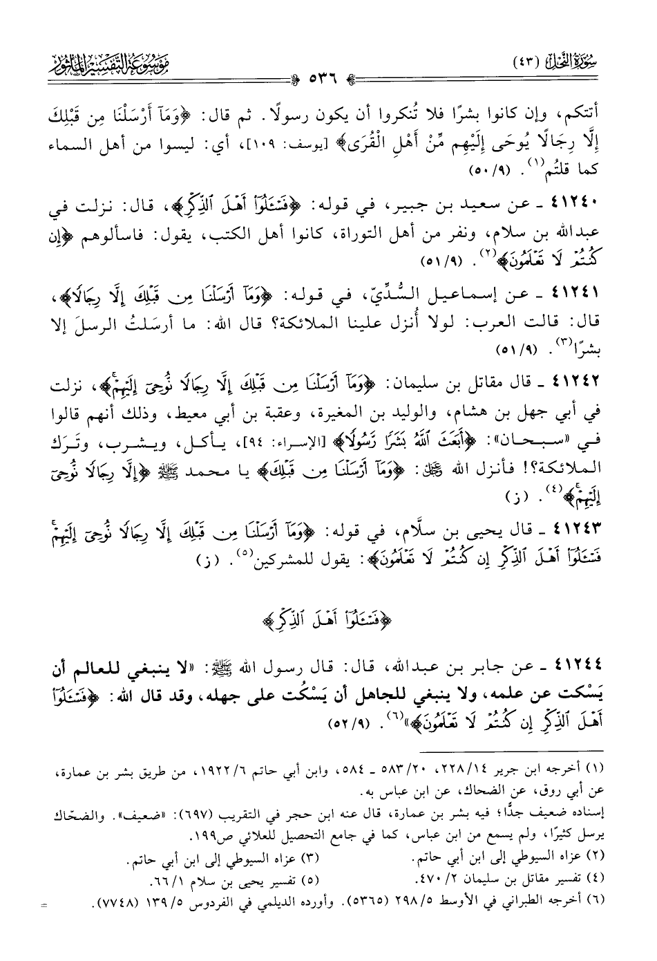 ٤١٢٤٠ - عن سعيد بن جبير، في قوله: {فسئلوا أهل الذّكر}، قال: نزلت في عبد الله بن سلام، ونفر من أهل التوراة، كانوا أهل الكتب، يقول: فاسألوهم {إن كنتم لا تعلمون} (¬٢). (٩/ ٥١)