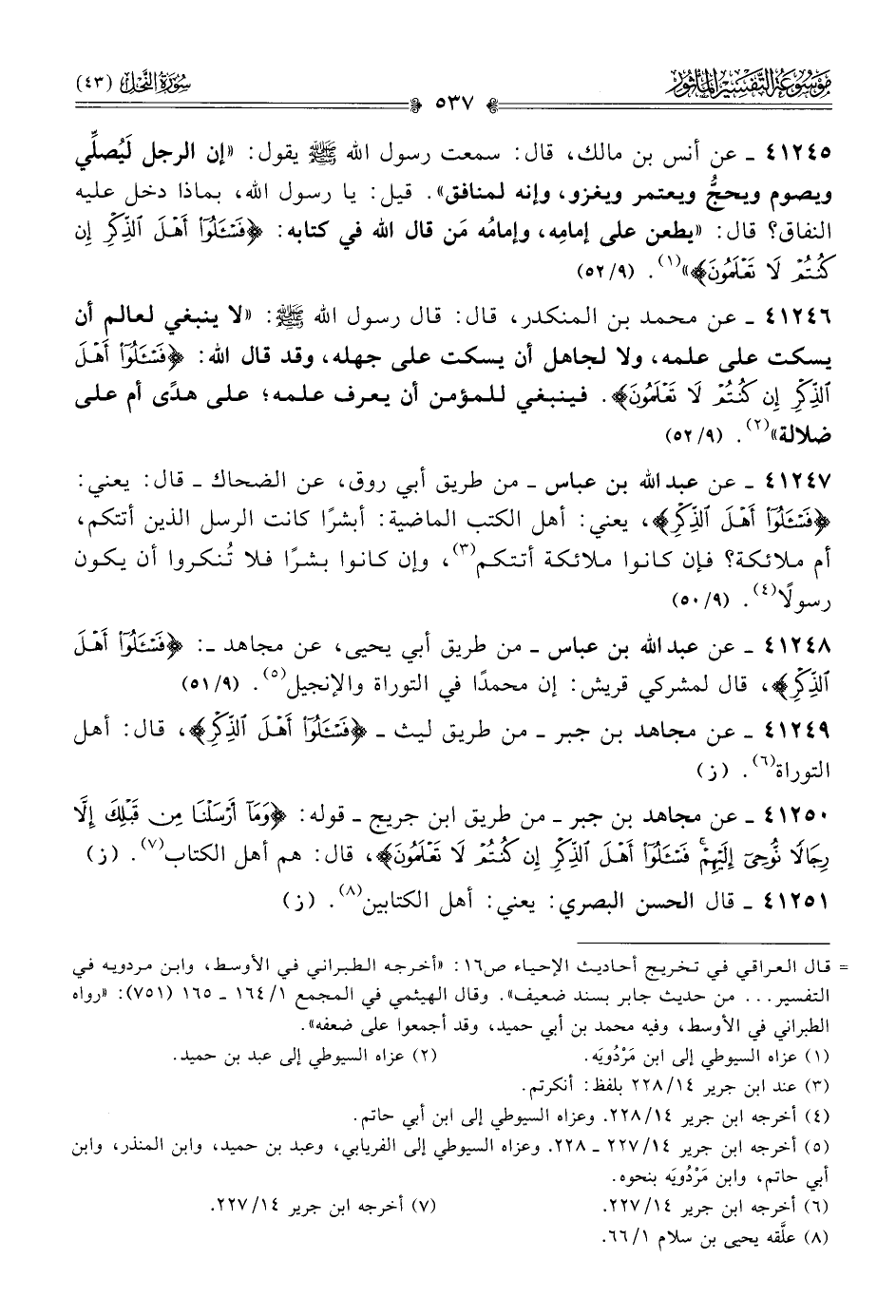 ٤١٢٤٥ - عن أنس بن مالك، قال: سمعت رسول الله - صلى الله عليه وسلم - يقول: «إن الرجل لَيُصلِّي ويصوم ويحجُّ ويعتمر ويغزو، وإنه لمنافق». قيل: يا رسول الله، بماذا دخل عليه النفاق؟ قال: «يطعن على إمامِه، وإمامُه مَن قال الله في كتابه: {فسئلوا أهل الذكر إن كنتم لا تعلمون}» (¬١). (٩/ ٥٢)
