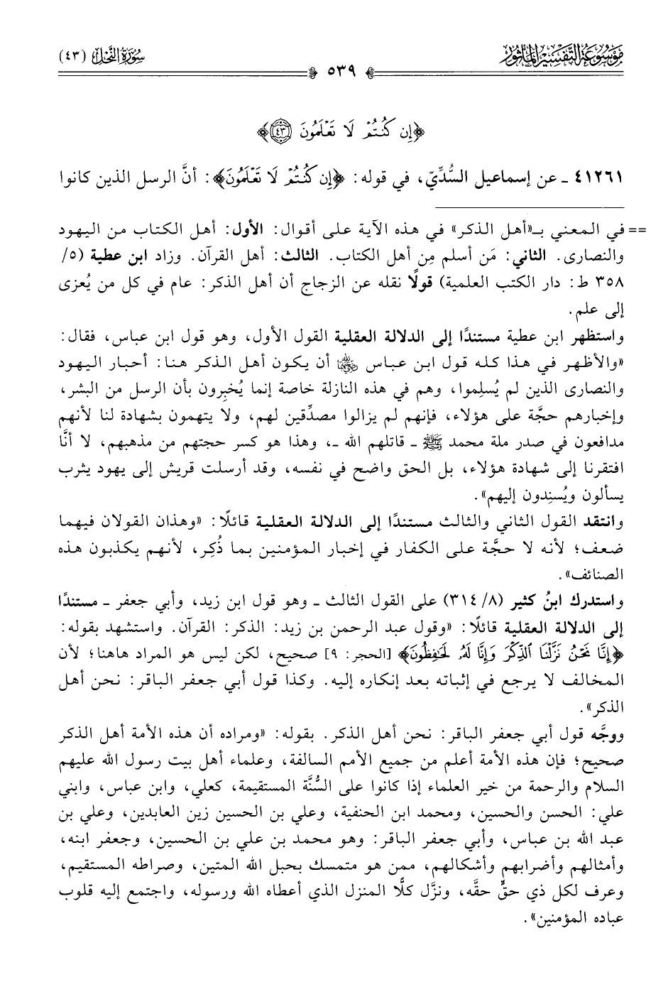 ٤١٢٦١ - عن إسماعيل السُّدِّيّ، في قوله: {إن كنتم لا تعلمون}: أنّ الرسل الذين كانوا