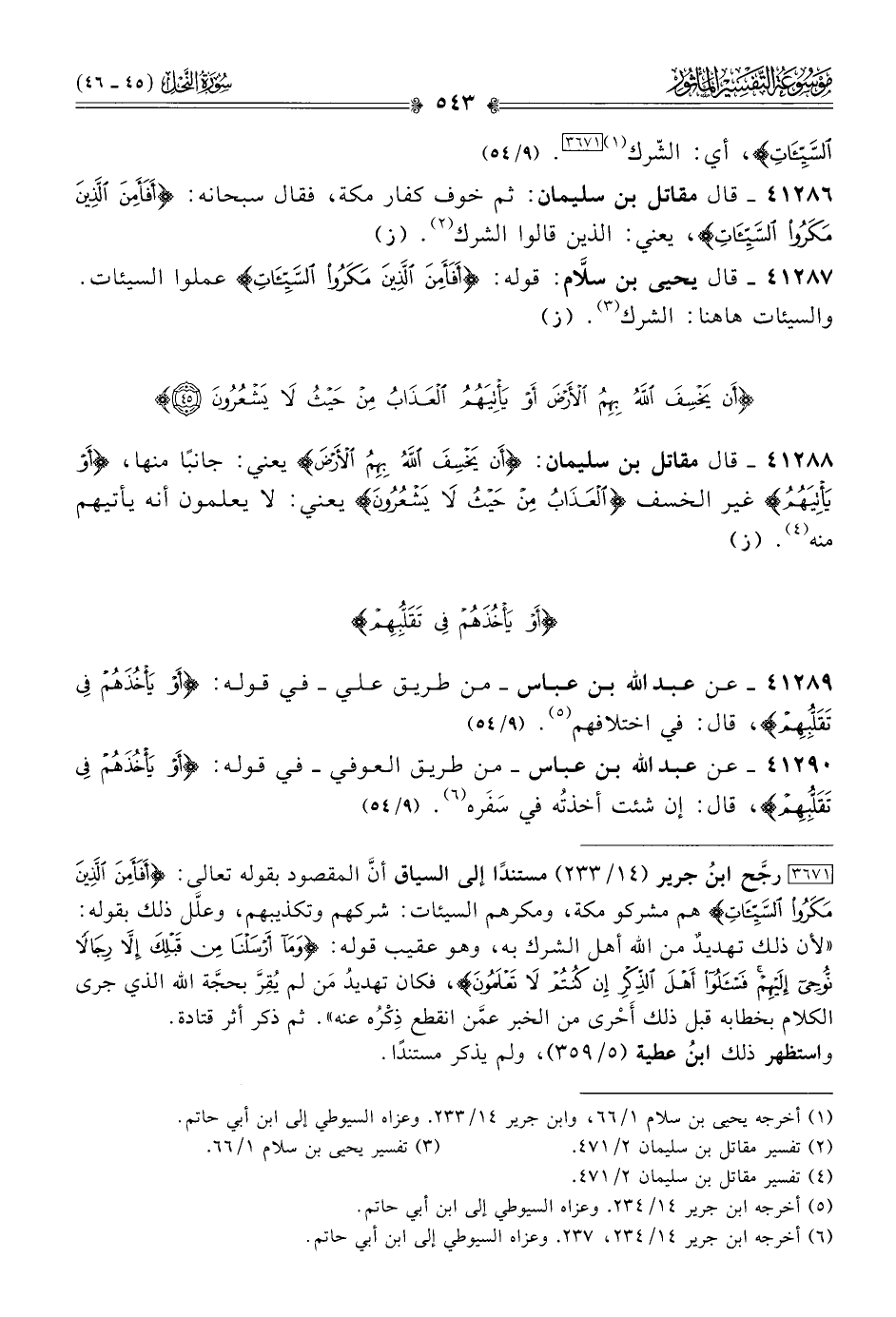 ٤١٢٨٧ - قال يحيى بن سلّام: قوله: {أفأمن الذين مكروا السيئات} عملوا السيئات. والسيئات هاهنا: الشرك (¬٣). (ز)