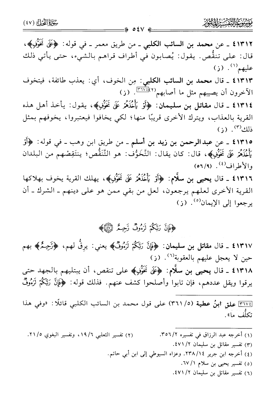 ٤١٣١٨ - قال يحيى بن سلّام: {على تخوف} على تنقص، أن يبتليهم بالجهد حتى يرقوا ويقل عددهم، فإن تابوا وأصلحوا كشف عنهم. فذلك قوله: {فإن ربكم لرءوف