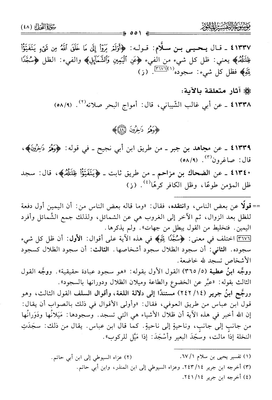 ٤١٣٣٧ - قال يحيى بن سلّام: قوله: {أولم يروا إلى ما خلق الله من شيء يتفيأ ظلاله} يعني: ظل كل شيء من الفيء {عن اليمين والشمائل} والفيء: الظل {سجدا لله} فظل كل شيء: سجوده (¬١) [٣٦٧٦]. (ز)