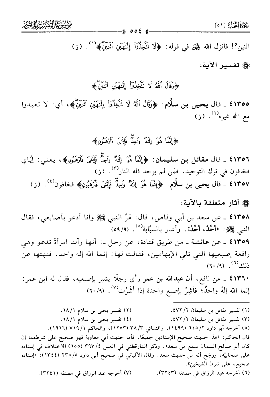 ٤١٣٥٥ - قال يحيى بن سلّام: {وقال الله لا تتخذوا إلهين اثنين}، أي: لا تعبدوا مع الله غيره (¬٢). (ز)