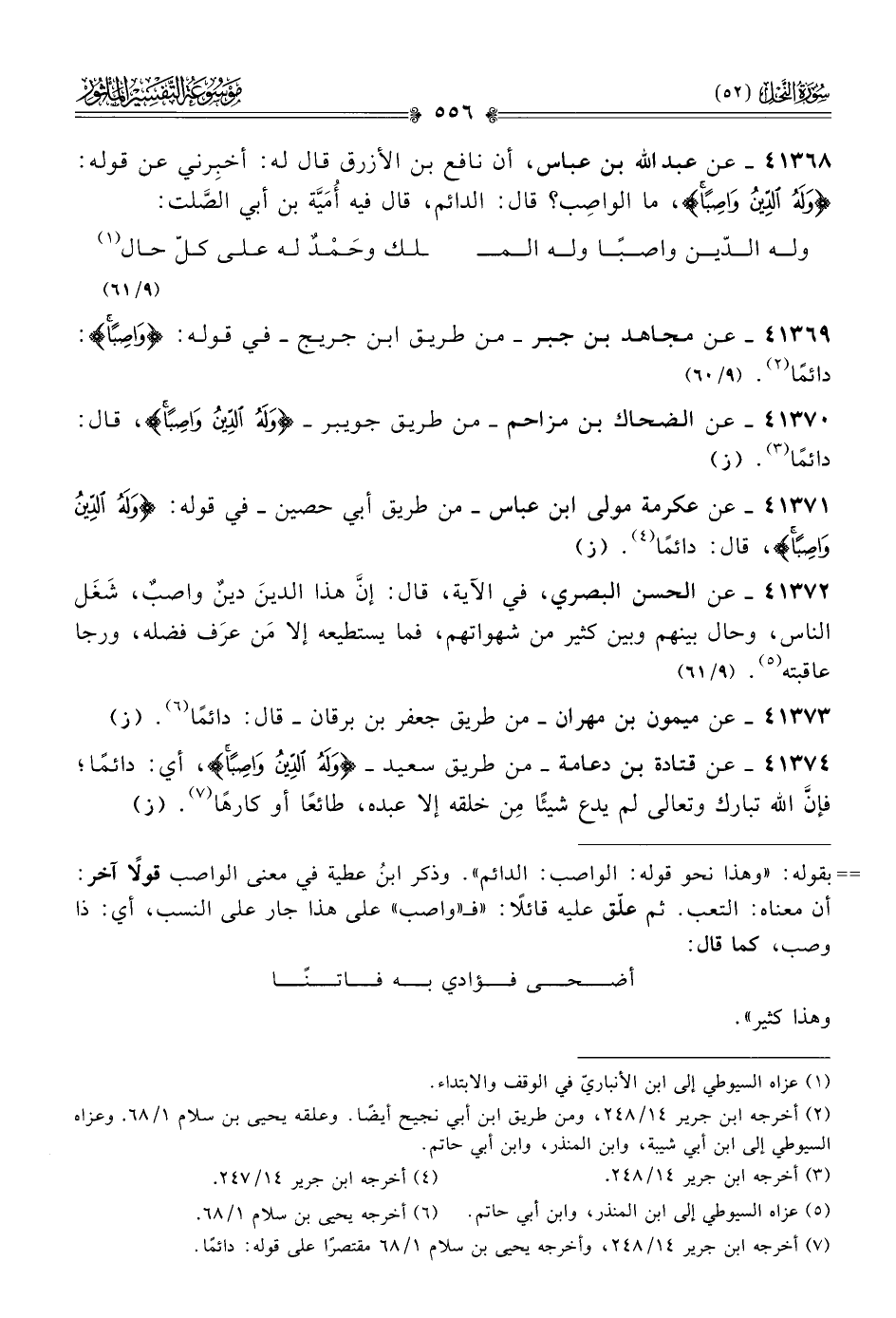 ٤١٣٦٨ - عن عبد الله بن عباس، أن نافع بن الأزرق قال له: أخبِرني عن قوله: {وله الدّين واصِبًا}، ما الواصِب؟ قال: الدائم، قال فيه أُمَيَّة بن أبي الصَّلت: