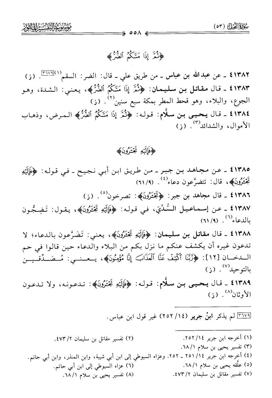 ٤١٣٨٥ - عن مجاهد بن جبر -من طريق ابن أبي نجيح- في قوله: {فإليه تجأرون}، قال: تتضرَّعون دعاء (¬٤). (٩/ ٦١)
