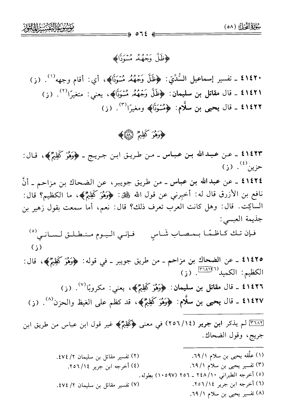 ٤١٤٢٤ - عن عبد الله بن عباس -من طريق جويبر، عن الضحاك بن مزاحم- أنّ نافع بن الأزرق قال له: أخبِرني عن قول الله - عز وجل -: {وهو كظيم}، ما الكظيم؟ قال: الساكِت. قال: وهل كانت العرب تعرف ذلك؟ قال: نعم، أما سمعت بقول زهير بن جذيمة العبسي: