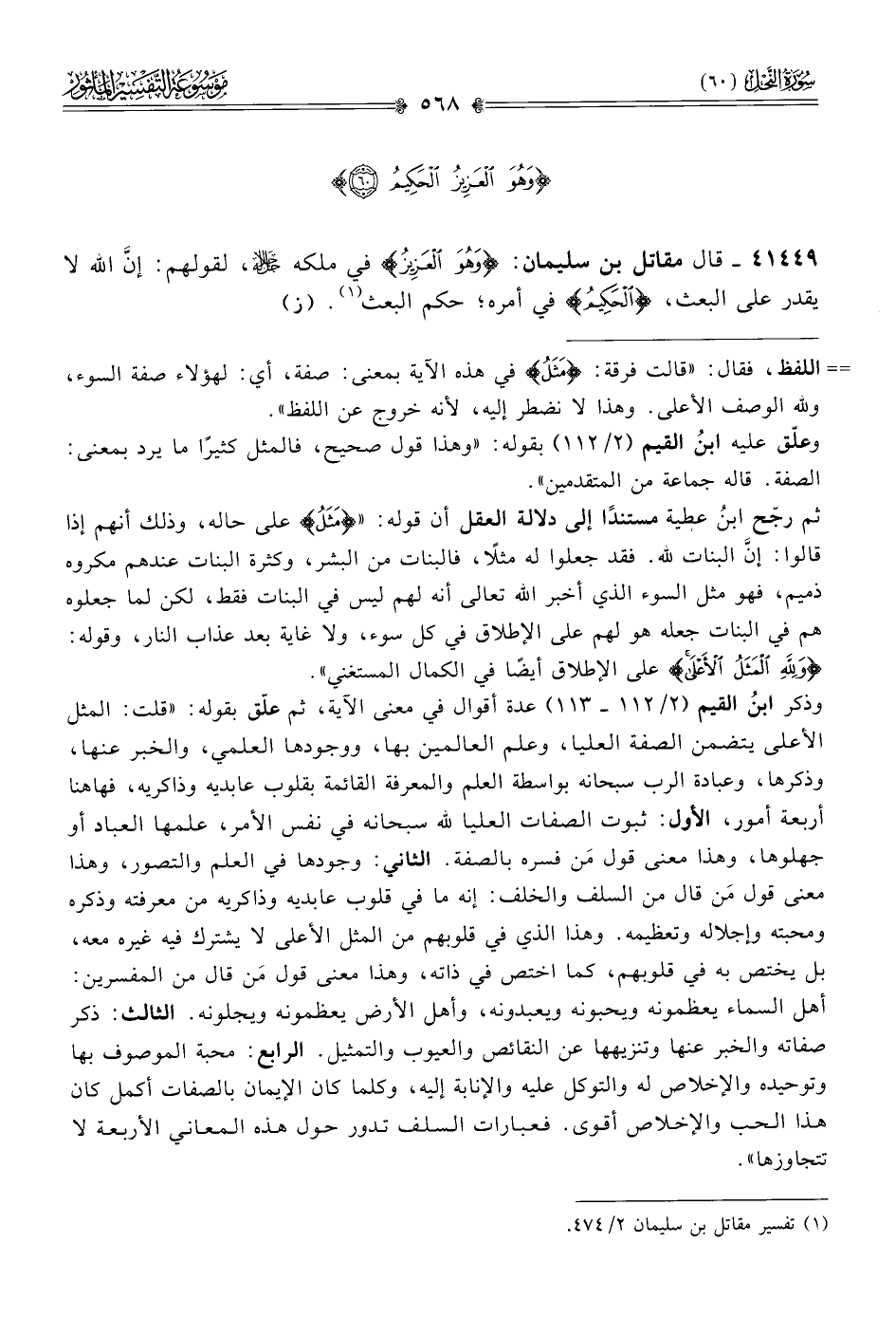 ٤١٤٤٩ - قال مقاتل بن سليمان: {وهُوَ العَزِيزُ} في ملكه جل جلاله، لقولهم: إنّ الله لا يقدر على البعث، {الحَكِيمُ} في أمره؛ حكم البعث (¬١). (ز)