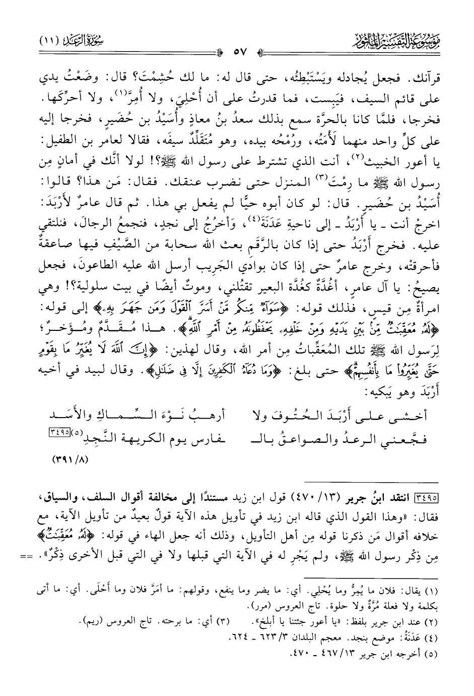 قرآنك. فجعل يُجادله ويَسْتَبْطِئُه، حتى قال له: ما لك حُشِمْتَ؟ قال: وضَعْتُ يدي على قائم السيف، فيَبِست، فما قدرتُ على أن أُحْلِيَ، ولا أُمِرَّ (¬١)، ولا أحرِّكَها. فخرجا، فلمّا كانا بالحرَّة سمع بذلك سعدُ بنُ معاذٍ وأُسَيْدُ بن حُضَيرٍ، فخرجا إليه على كلِّ واحد منهما لَأْمَتُه، ورُمْحُه بيده، وهو مُتَقَلِّدٌ سيفَه، فقالا لعامر بن الطفيل: يا أعور الخبيث (¬٢)، أنت الذي تشترط على رسول الله - صلى الله عليه وسلم -؟! لولا أنّك في أمانٍ مِن رسول الله - صلى الله عليه وسلم - ما رِمْتَ (¬٣) المنزل حتى نضرب عنقك. فقال: مَن هذا؟ قالوا: أُسَيْدُ بن حُضَيرٍ. قال: لو كان أبوه حيًّا لم يفعل بي هذا. ثم قال عامرٌ لأَرْبَدَ: اخرجْ أنت -يا أرْبَدُ- إلى ناحيةِ عَدَنَةَ (¬٤)، وأخرُجُ إلى نجدٍ، فنجمعُ الرجالَ، فنلتقي عليه. فخرج أرْبَدُ حتى إذا كان بالرَّقَمِ بعث الله سحابة من الصَّيْفِ فيها صاعقةٌ فأحرقتْه، وخرج عامرٌ حتى إذا كان بوادي الجَرِيب أرسل الله عليه الطاعونَ، فجعل يصيحُ: يا آل عامرٍ، أغُدَّةٌ كغُدَّة البعير تقتُلني، وموتٌ أيضًا في بيت سلولية؟! وهي امرأةٌ مِن قيسٍ، فذلك قوله: {سواءٌ منكم مَّن أسرَّ القولَ ومن جهرَ به} إلى قوله: {له معقباتٌ من بين يديه ومن خلفِهِ يحفظونهُ من أمرِ الله}. هذا مُقَدَّمٌ ومُؤَخرٌ؛ لِرَسول الله - صلى الله عليه وسلم - تلك المُعَقِّباتُ مِن أمر الله، وقال لهذين: {إن الله لا يغيرُ ما بقومٍ حتى يغيروا ما بأنفسهم} حتى بلغ: {وما دُعاءُ الكافرينَ إلا في ضلالٍ}. وقال لبيد في أخيه أرْبَدَ وهو يَبكيه: