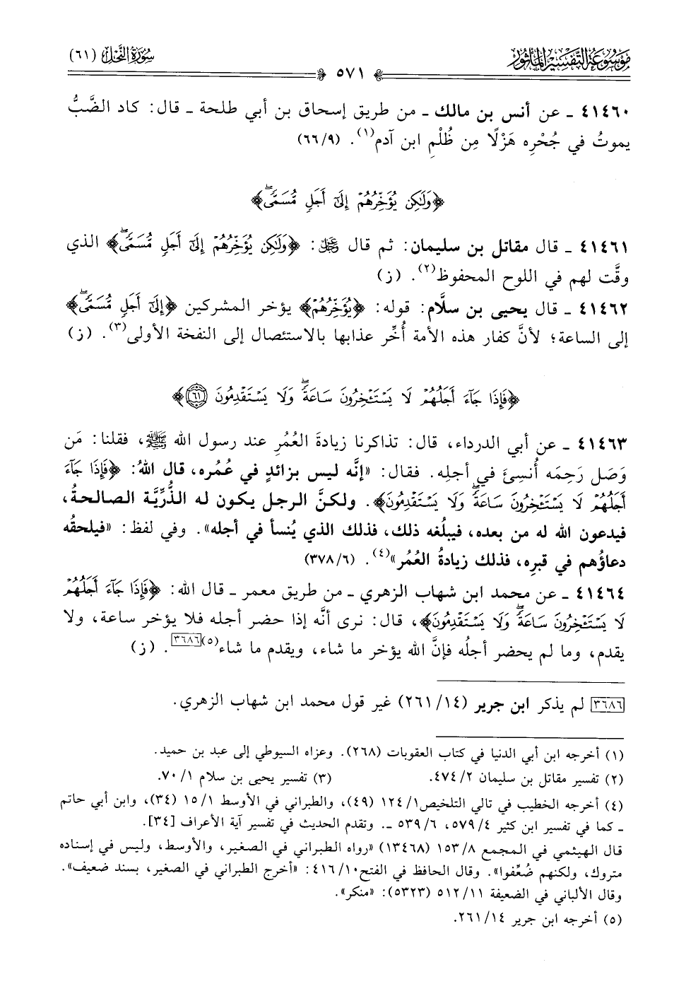٤١٤٦٤ - عن محمد ابن شهاب الزهري -من طريق معمر- قال الله: {فإذا جاء أجلهم لا يستأخرون ساعة ولا يستقدمون}، قال: نرى أنّه إذا حضر أجله فلا يؤخر ساعة، ولا يقدم، وما لم يحضر أجلُه فإنّ الله يؤخر ما شاء، ويقدم ما شاء (¬٥) [٣٦٨٦]. (ز)