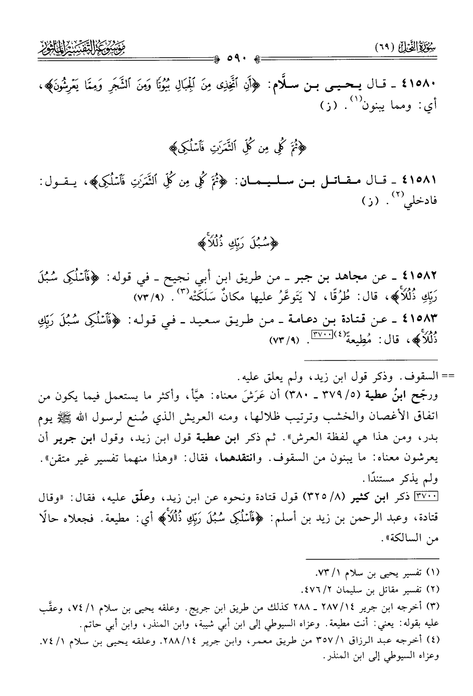 ٤١٥٨٢ - عن مجاهد بن جبر -من طريق ابن أبي نجيح- في قوله: {فاسلُكي سبل ربك ذللًا}، قال: طُرُقًا، لا يَتَوعَّرُ عليها مكانٌ سَلَكَتْه (¬٣). (٩/ ٧٣)