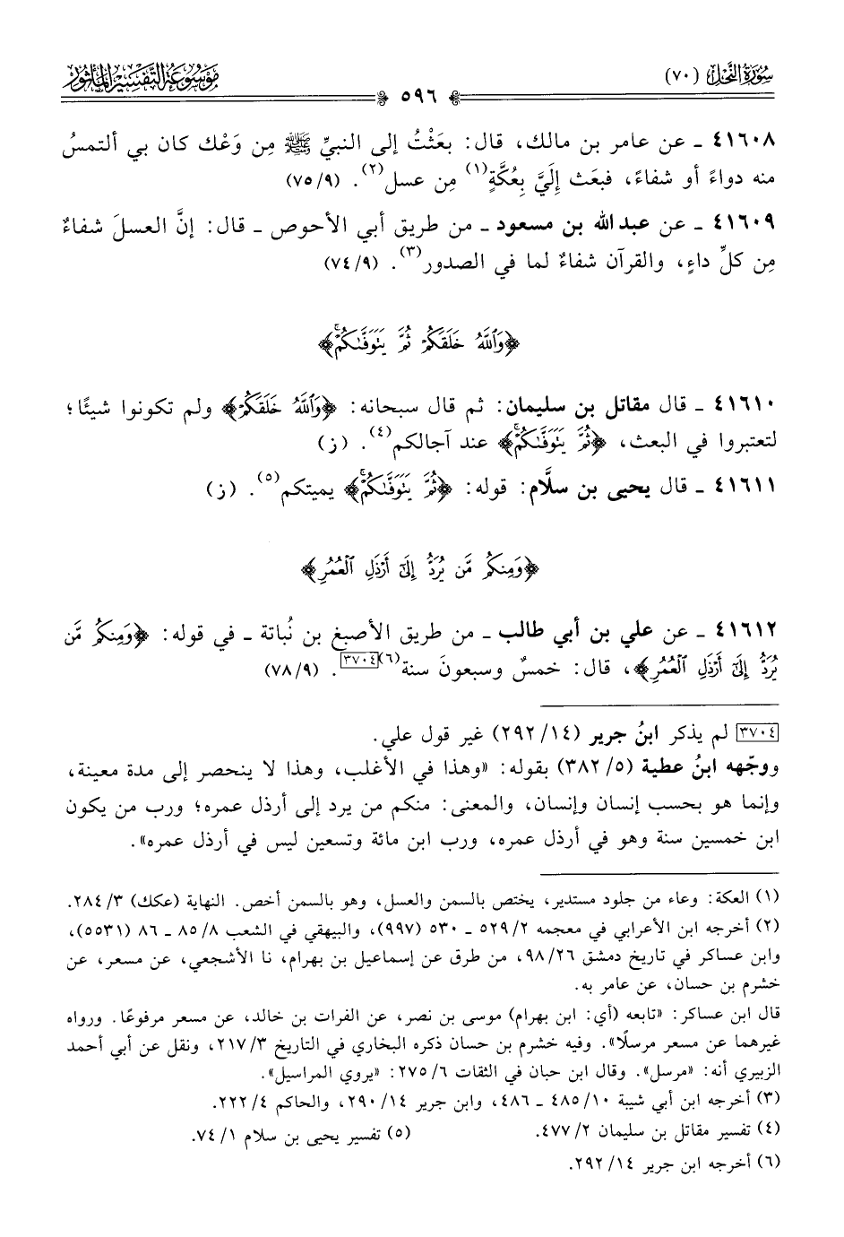 ٤١٦١٢ - عن علي بن أبي طالب -من طريق الأصبغ بن نُباتة- في قوله: {ومنكم من يرد إلى أرذل العمر}، قال: خمسٌ وسبعونَ سنة (¬٦) [٣٧٠٤]. (٩/ ٧٨)