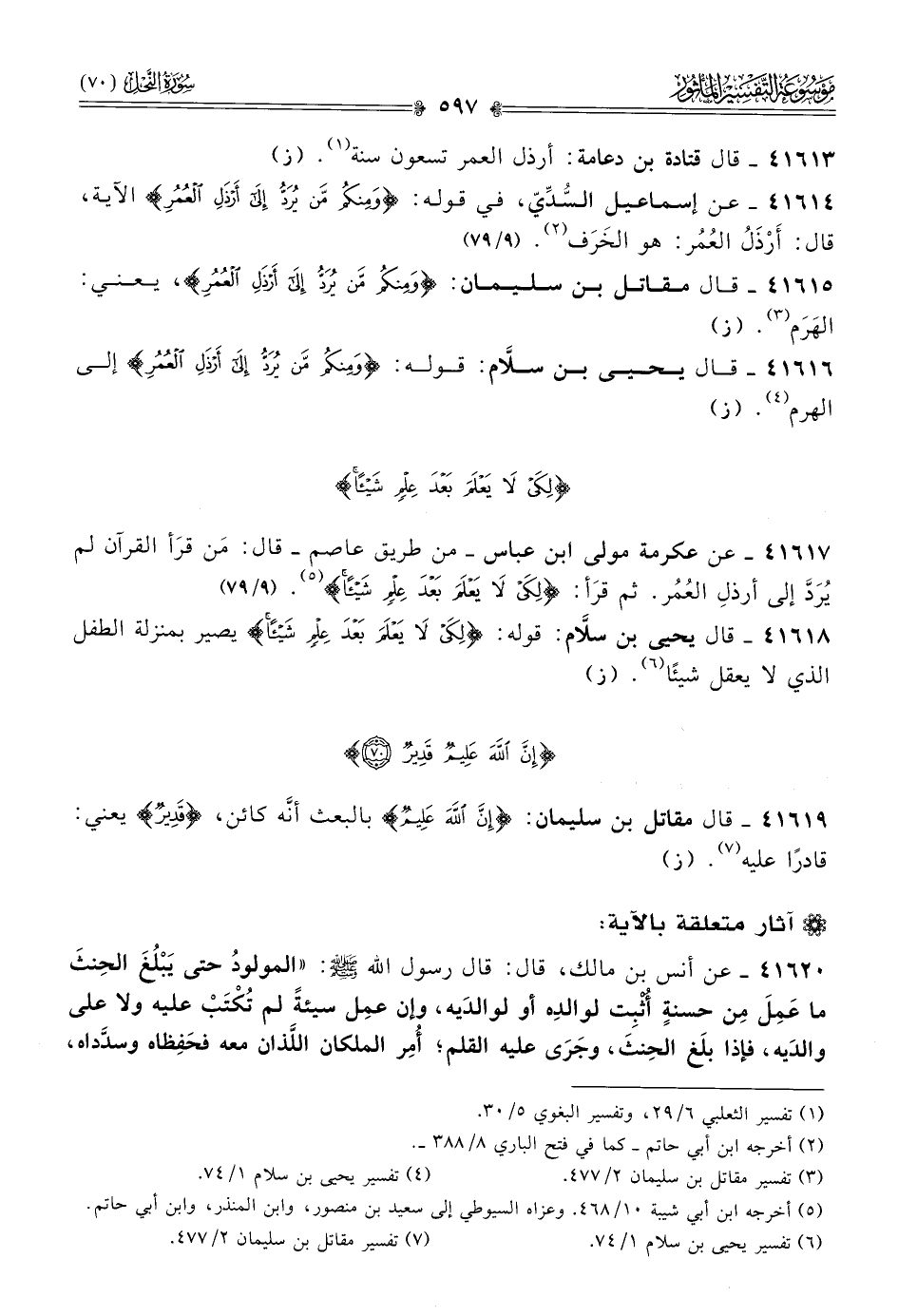 ٤١٦١٤ - عن إسماعيل السُّدِّيّ، في قوله: {ومنكم من يرد إلى أرذل العمر} الآية، قال: أرْذَلُ العُمُر: هو الخَرَف (¬٢). (٩/ ٧٩)