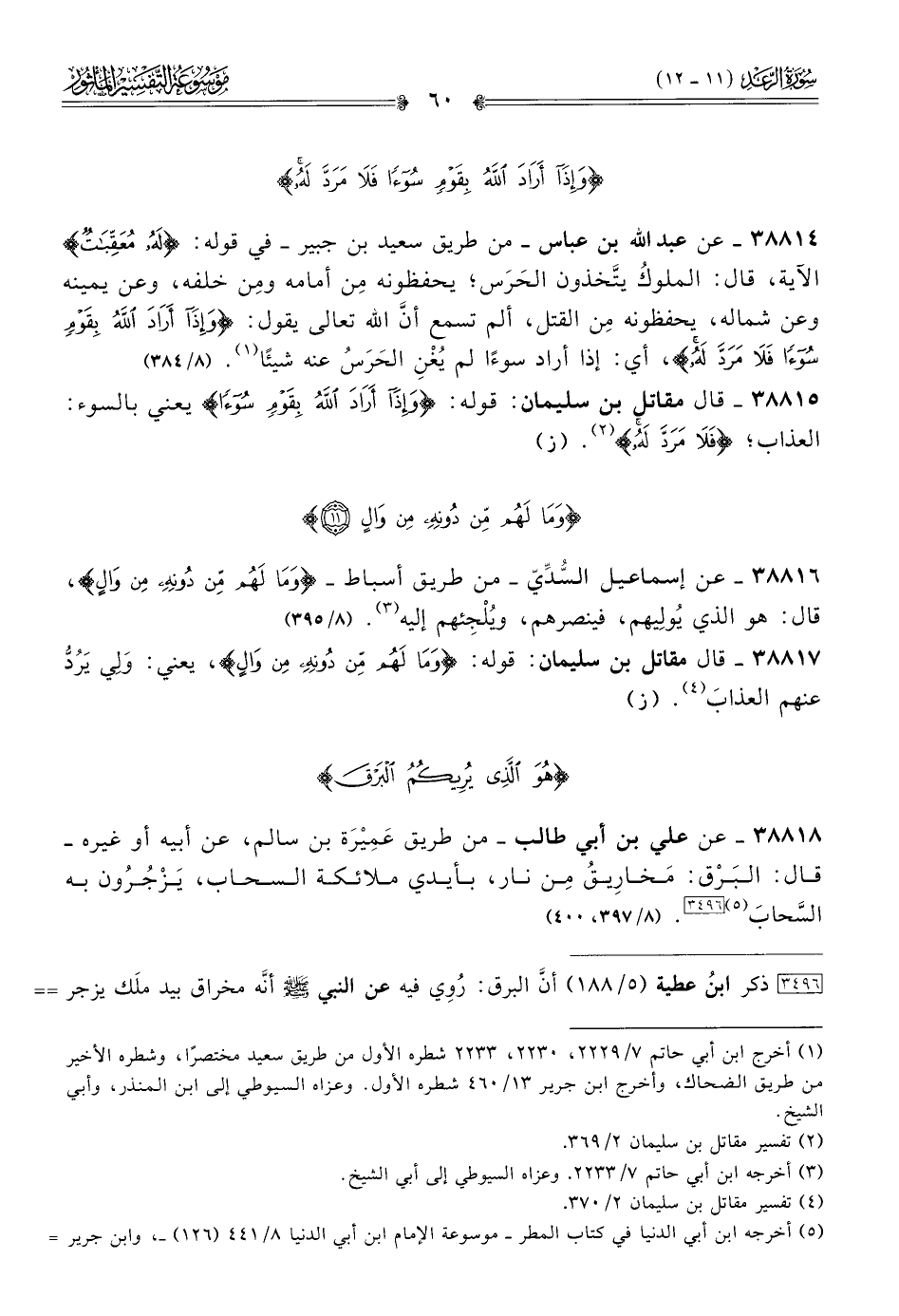 ٣٨٨١٤ - عن عبد الله بن عباس -من طريق سعيد بن جبير- في قوله: {له معقبات} الآية، قال: الملوكُ يتَّخذون الحَرَس؛ يحفظونه مِن أمامه ومِن خلفه، وعن يمينه وعن شماله، يحفظونه مِن القتل، ألم تسمع أنّ الله تعالى يقول: {وإذا أراد الله بقومٍ سوءًا فلا مردَّ له}. أي: إذا أراد سوءًالم يُغْنِ الحَرَسُ عنه شيئًا (¬١). (٨/ ٣٨٤)