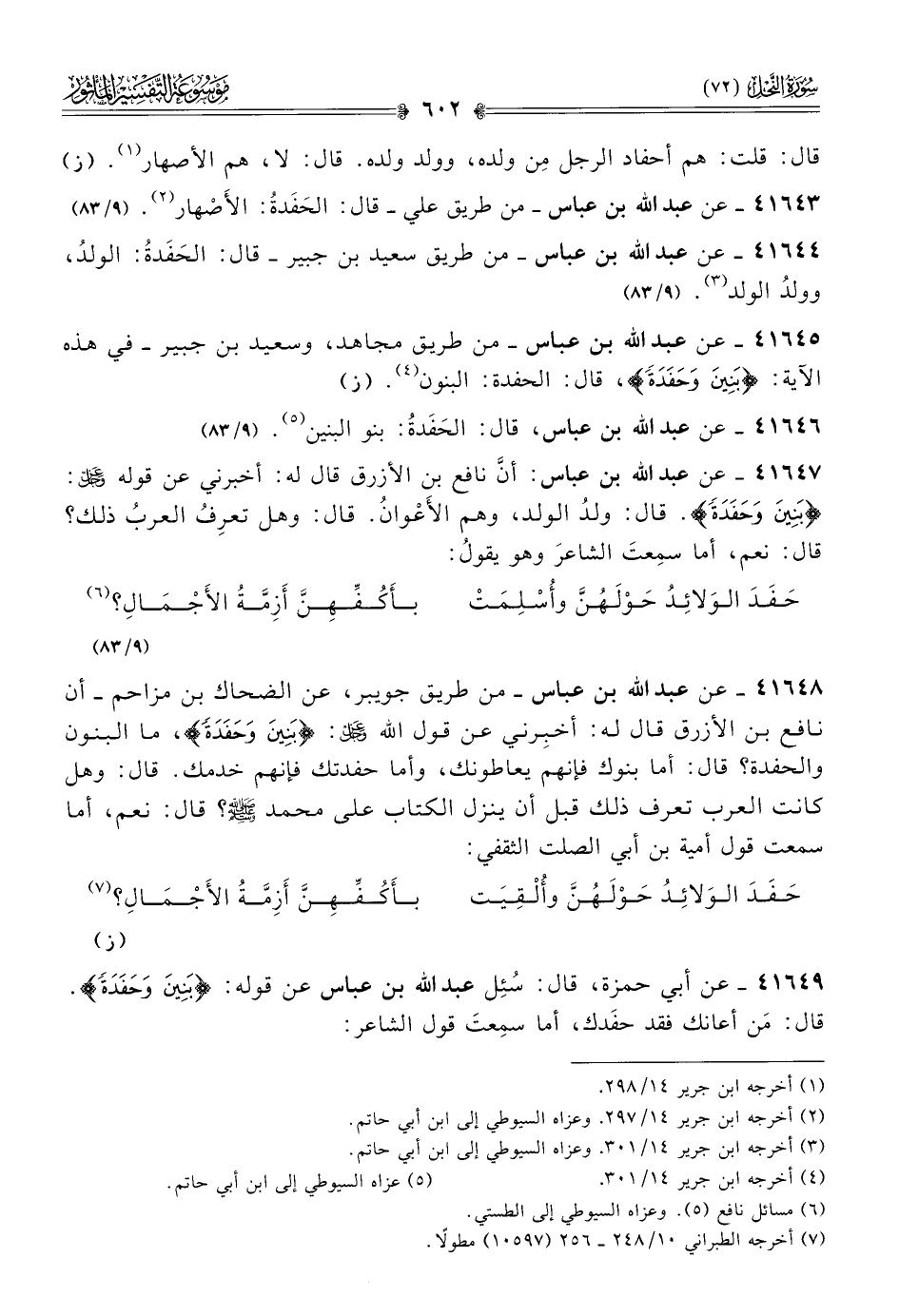 ٤١٦٤٧ - عن عبد الله بن عباس: أنّ نافع بن الأزرق قال له: أخبرني عن قوله - عز وجل -: {بنين وحفدة}. قال: ولدُ الولد، وهم الأَعْوانُ. قال: وهل تعرِفُ العربُ ذلك؟ قال: نعم، أما سمِعتَ الشاعرَ وهو يقولُ: