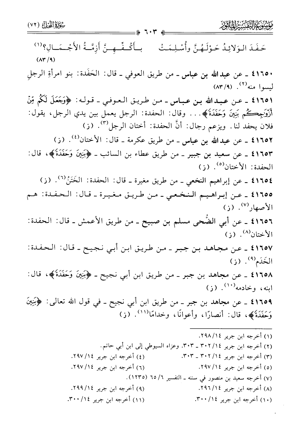 ٤١٦٥٩ - عن مجاهد بن جبر -من طريق ابن أبي نجيح- في قول الله تعالى: {بنين وحفدة}، قال: أنصارًا، وأعوانًا، وخدامًا (¬١١). (ز)
