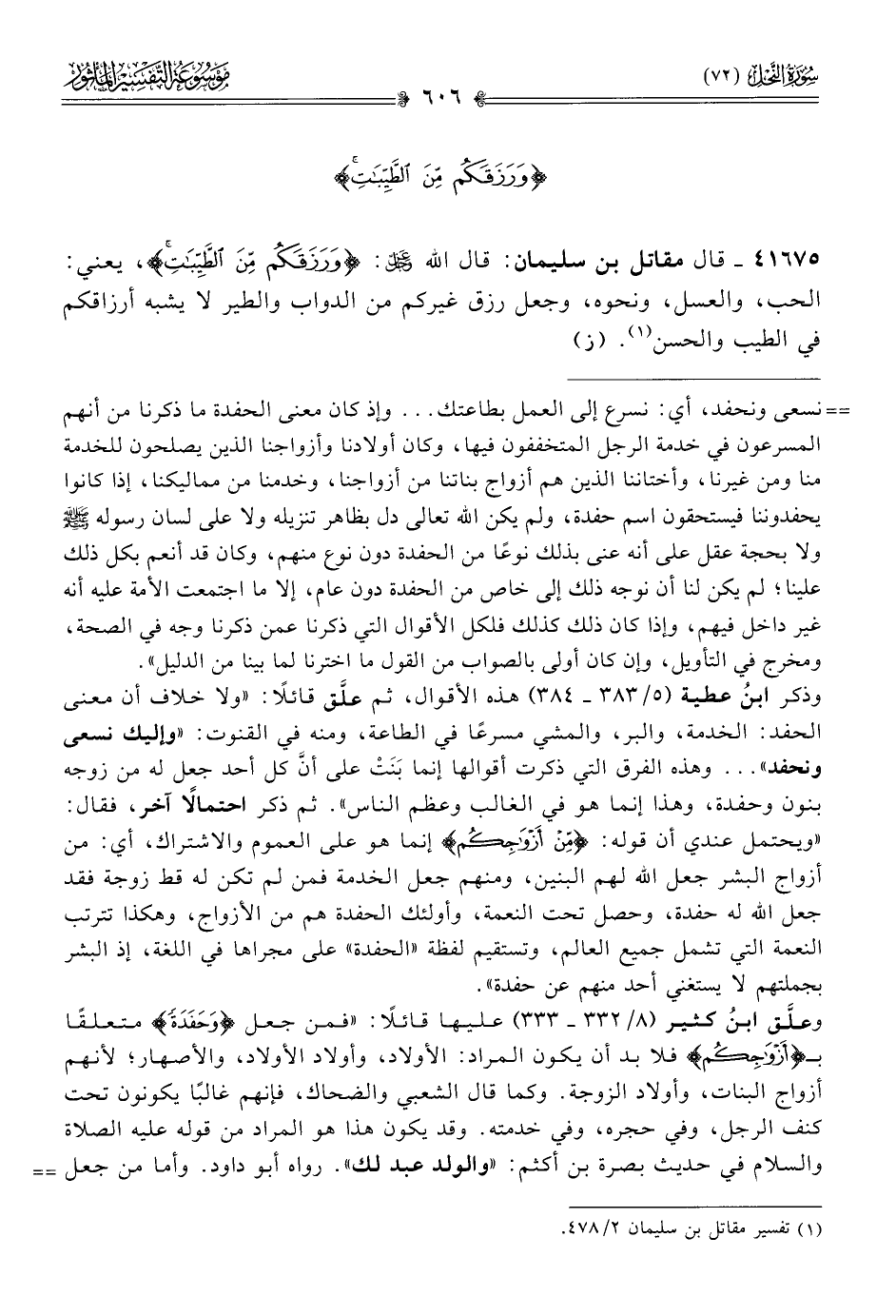 ٤١٦٧٥ - قال مقاتل بن سليمان: قال الله - عز وجل - {ورَزَقَكُمْ مِنَ الطَّيِّباتِ}، يعني: الحب، والعسل، ونحوه، وجعل رزق غيركم من الدواب والطير لا يشبه أرزاقكم في الطيب والحسن (¬١). (ز)