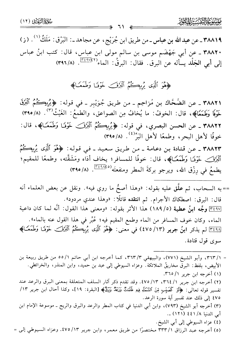 [٣٤٩٨] لم يذكر ابنُ جرير (١٣/ ٤٧٥) في معنى: {هُوَ الَّذِي يُرِيكُمُ البَرْقَ خَوْفًا وطَمَعًا} سوى قول قتادة.