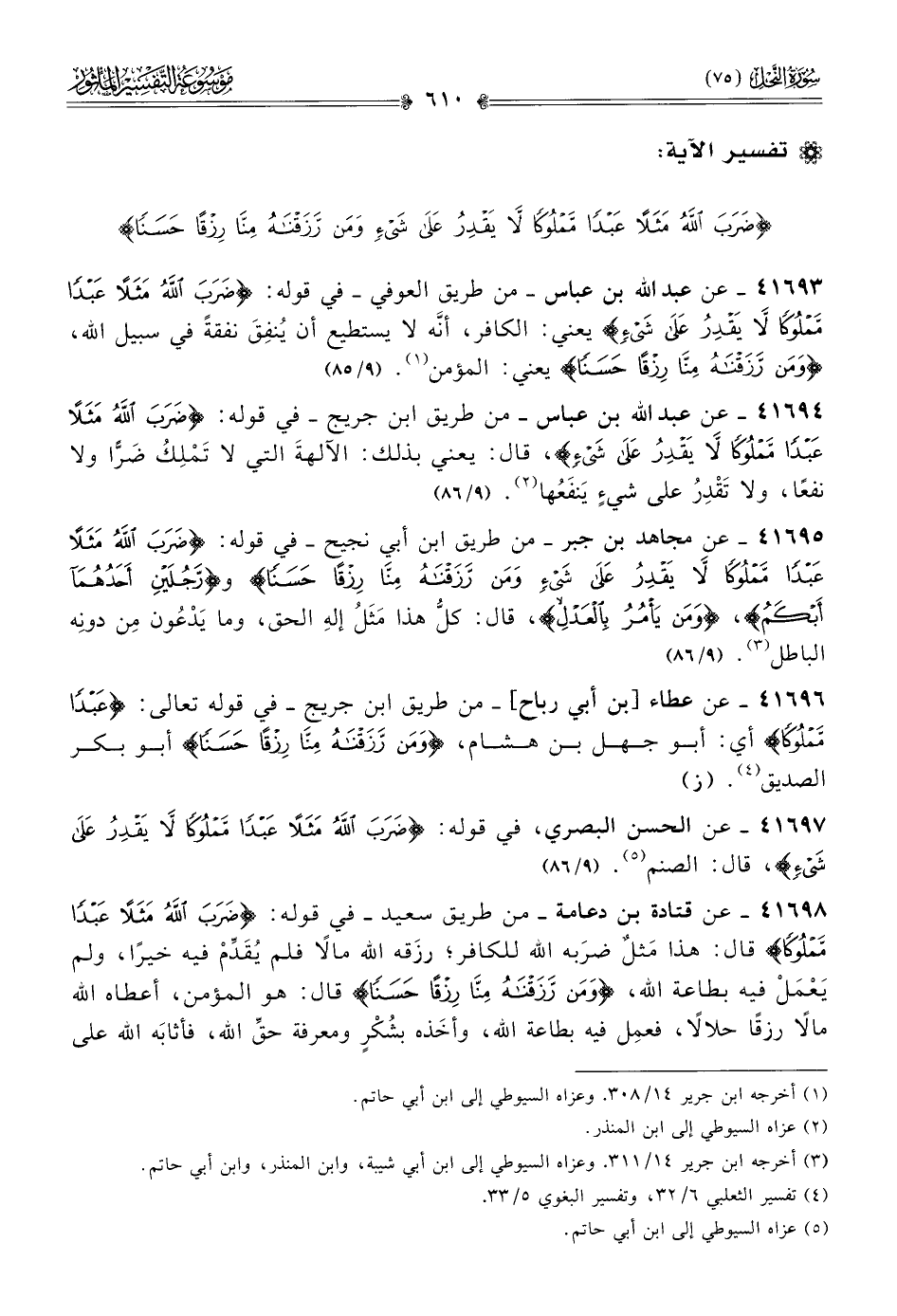 ٤١٦٩٣ - عن عبد الله بن عباس -من طريق العوفي- في قوله: {ضرب الله مثلًا عبدًا مملوكًا لا يقدر على شيء} يعني: الكافر، أنّه لا يستطيع أن يُنفِقَ نفقةً في سبيل الله، {ومن رزقناه منا رزقًا حسنًا} يعني: المؤمن (¬١). (٩/ ٨٥)