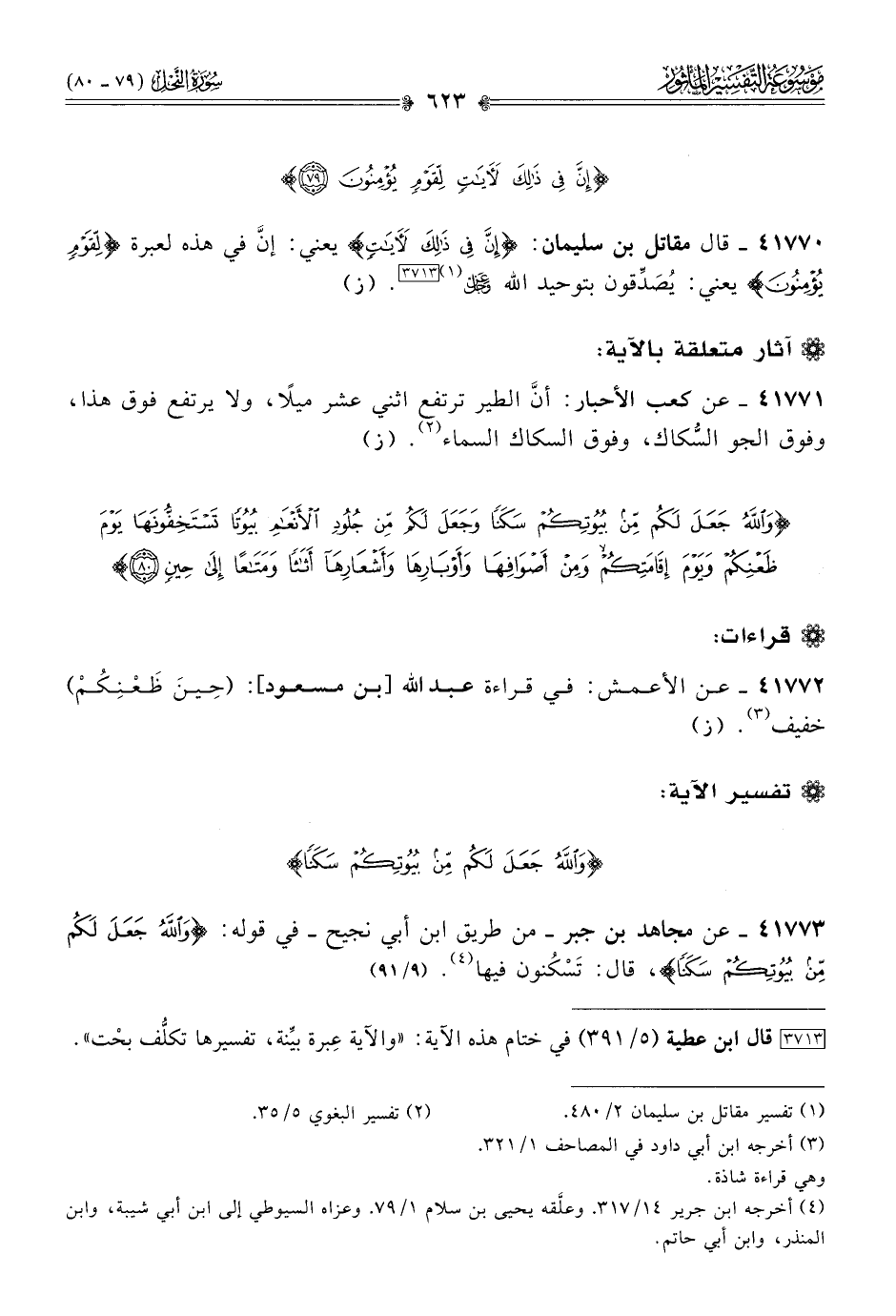 ٤١٧٧٠ - قال مقاتل بن سليمان: {إنَّ فِي ذلِكَ لَآياتٍ} يعني: إنّ في هذه لعبرة {لِقَوْمٍ يُؤْمِنُونَ} يعني: يُصَدِّقون بتوحيد الله - عز وجل - (¬١) [٣٧١٣]. (ز)
