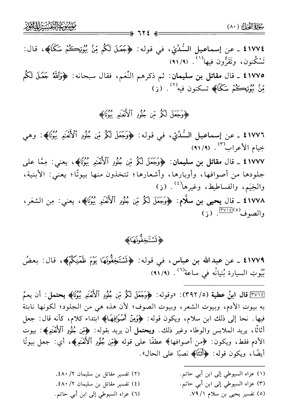 ٤١٧٧٦ - عن إسماعيل السُّدِّيّ، في قوله: {وجعل لكم من جلود الأنعام بيوتًا}: وهي خِيام الأعراب (¬٣). (٩/ ٩١)