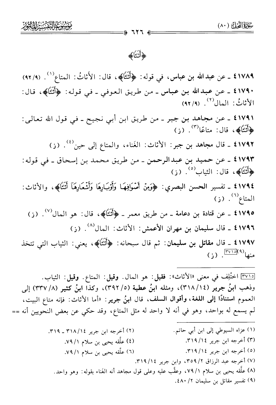 ٤١٧٩٢ - قال مجاهد بن جبر: الأثاث: الغَناء، والمتاع إلى حين (¬٤). (ز)