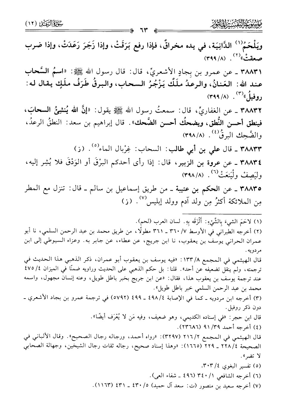 ٣٨٨٣١ - عن عمرو بن بِجادٍ الأشعريِّ، قال: قال رسول الله - صلى الله عليه وسلم -: «اسمُ السَّحاب عند الله: العَنانُ، والرعدُ ملَكٌ يَزْجُرُ السحاب، والبرقُ طَرَفُ ملَكٍ يقال له: روفيلُ» (¬٣). (٨/ ٣٩٩)