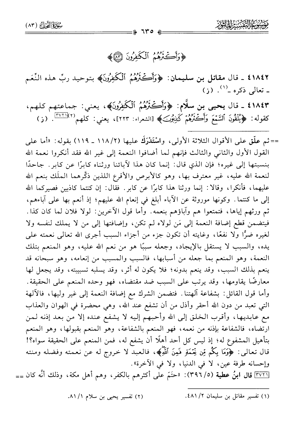 ٤١٨٤٢ - قال مقاتل بن سليمان: {وأَكْثَرُهُمُ الكافِرُونَ} بتوحيد ربِّ هذه النِّعَم -تعالى ذكره- (¬١). (ز)