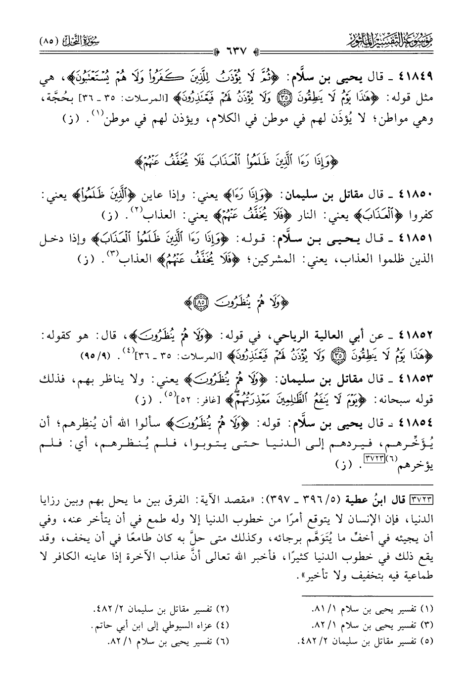 ٤١٨٤٩ - قال يحيى بن سلّام: {ثم لا يؤذن للذين كفروا ولا هم يستعتبون}، هي مثل قوله: {هذا يوم لا ينطقون * ولا يؤذن لهم فيعتذرون} [المرسلات: ٣٥ - ٣٦] بحُجَّة، وهي مواطن؛ لا يُؤذَن لهم في موطن في الكلام، ويؤذن لهم في موطن (¬١). (ز)