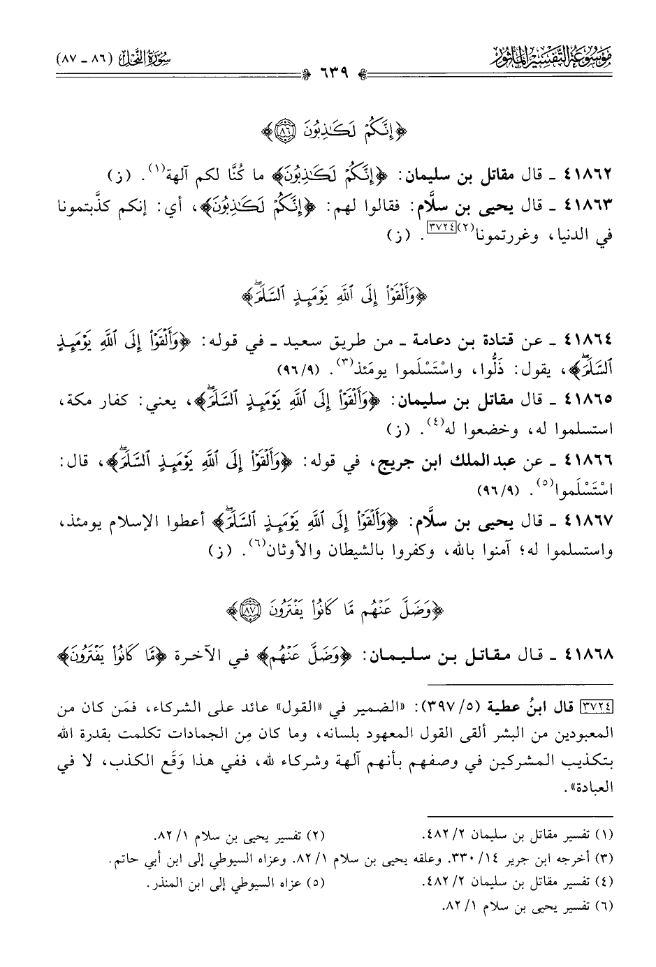 [٣٧٢٤] قال ابنُ عطية (٥/ ٣٩٧): «الضمير في» القول «عائد على الشركاء، فمَن كان من المعبودين من البشر ألقى القول المعهود بلسانه، وما كان مِن الجمادات تكلمت بقدرة الله بتكذيب المشركين في وصفهم بأنهم آلهة وشركاء لله، ففي هذا وقَع الكذب، لا في العبادة».