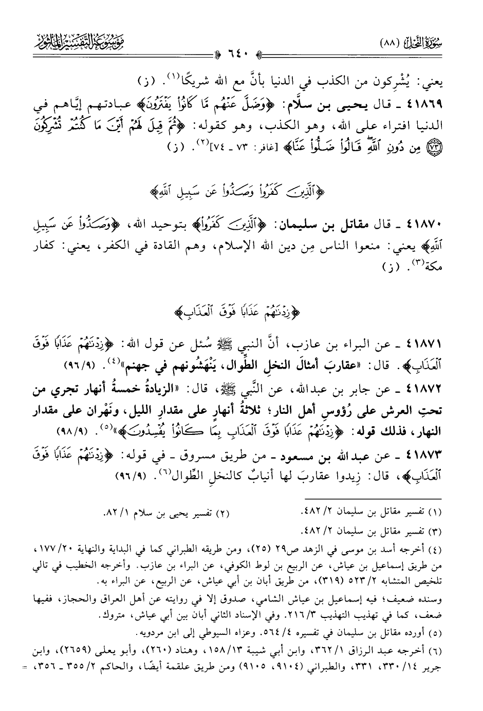 ٤١٨٧٢ - عن جابر بن عبد الله، عن النَّبي - صلى الله عليه وسلم -، قال: «الزيادةُ خمسةُ أنهار تجري من تحتِ العرش على رُؤوسِ أهل النار؛ ثلاثةُ أنهارٍ على مقدارِ الليل، ونَهْران على مقدار النهار، فذلك قوله: {زدناهم عذابًا فوق العذاب بما كانوا يفسدون}» (¬٥). (٩/ ٩٨)