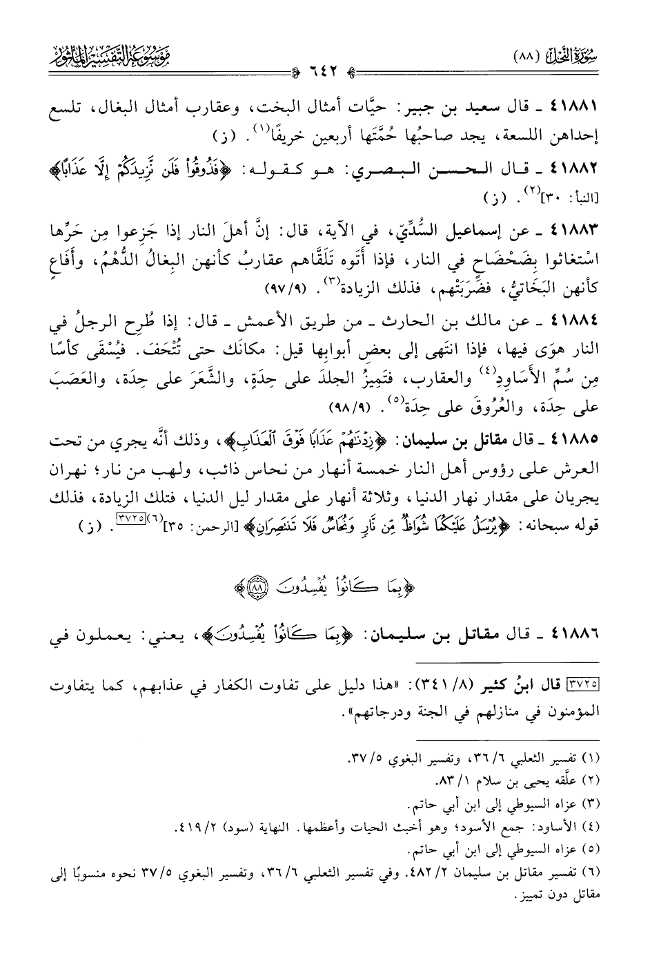 ٤١٨٨٥ - قال مقاتل بن سليمان: {زِدْناهُمْ عَذابًا فَوْقَ العَذابِ}، وذلك أنّه يجري من تحت العرش على رؤوس أهل النار خمسة أنهار من نحاس ذائب، ولهب من نار؛ نهران يجريان على مقدار نهار الدنيا، وثلاثة أنهار على مقدار ليل الدنيا، فتلك الزيادة، فذلك قوله سبحانه: {يُرْسَلُ عَلَيْكُما شُواظٌ مِن نارٍ ونُحاسٌ فَلا تَنْتَصِرانِ} [الرحمن: ٣٥] (¬٦) [٣٧٢٥]. (ز)