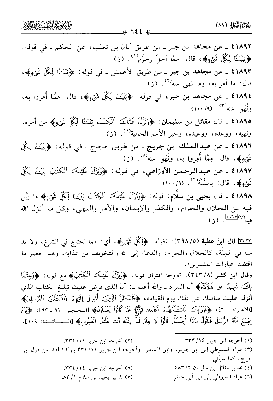 ٤١٨٩٨ - قال يحيى بن سلّام: قوله: {ونزلنا عليك الكتاب تبيانا لكل شيء} ما بيَّن فيه من الحلال والحرام، والكفر والإيمان، والأمر والنهي، وكل ما أنزل الله فيه (¬٧) [٣٧٢٧]. (ز)