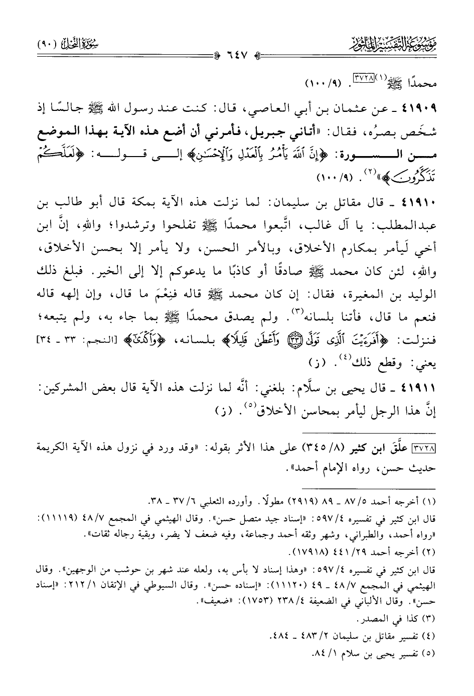 ٤١٩٠٩ - عن عثمان بن أبي العاصي، قال: كنت عند رسول الله - صلى الله عليه وسلم - جالسًا إذ شخَص بصرُه، فقال: «أتاني جبريل، فأمرني أن أضع هذه الآية بهذا الموضع من السورة: {إن الله يأمر بالعدل والإحسان} إلى قوله: {لعلكم تذكَّرون}» (¬٢). (٩/ ١٠٠)