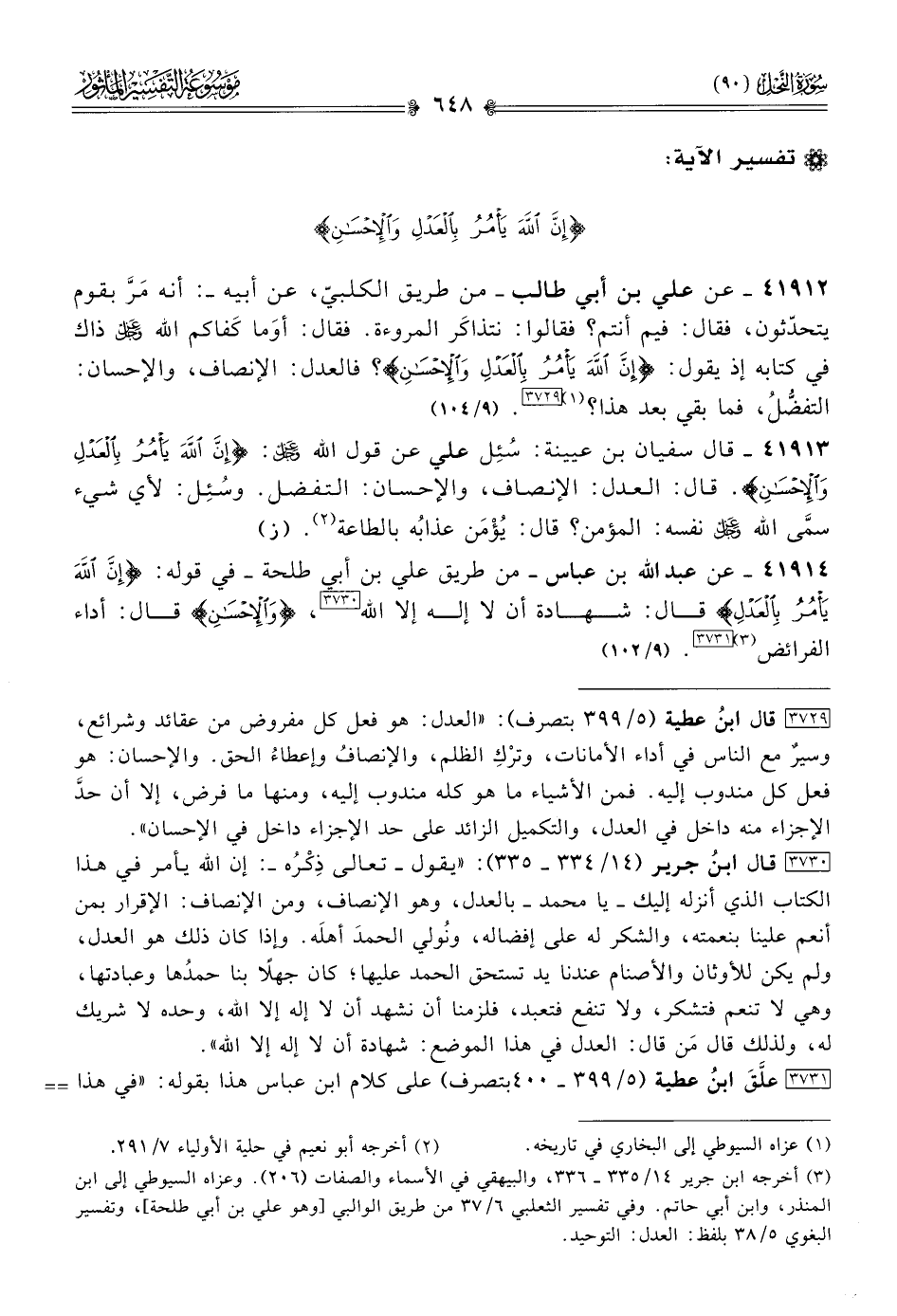 [٣٧٣١] علَّقَ ابنُ عطية (٥/ ٣٩٩ - ٤٠٠ بتصرف) على كلام ابن عباس هذا بقوله: «في هذا نظر؛ لأن أداء الفرائض هي الإسلام حسبما فسره رسول الله - صلى الله عليه وسلم - في حديث سؤال جبريل - عليه السلام -، وذلك هو العدل، وإنما الإحسان التكميلات والمندوب إليه، حسبما يقتضيه تفسير النبي - صلى الله عليه وسلم - لسؤال جبريل - عليه السلام -، بقوله: «أن تعبد الله كأنك تراه، فإن لم تكن تراه فإنه يراك». فإن صحَّ هذا عن ابن عباس فإنما أراد: أداء الفرائض مُكَمَّلَة».