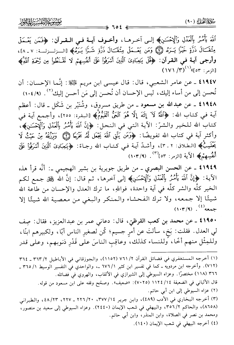 ٤١٩٤٩ - عن الحسن البصري -من طريق جويرية بن بشير الهجيمي- أنّه قرأ هذه الآية: {إن الله يأمر بالعدل والإحسان} إلى آخرها، ثم قال: إنّ الله - عز وجل - جمع لكم الخير كلَّه والشر كلَّه في آية واحدة، فواللهِ، ما ترك العدل والإحسان من طاعة الله شيئًا إلا جمعه، ولا ترك الفحشاء والمنكر والبغي من معصية الله شيئًا إلا جمعه (¬٤). (٩/ ١٠٣)
