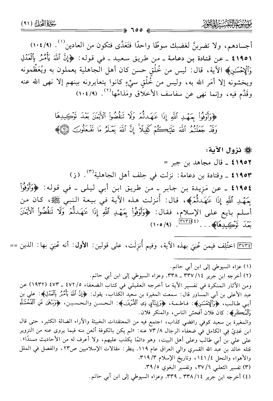 ومن الآثار المنكرة في تفسير الآية ما أخرجه العقيلي في كتاب الضعفاء ٥/ ٤٧٢ - ٤٧٣ (١٩٣٢) عن عبد الأعلى بن أبي المساور قال: سمعت المغيرة بن سعيد الكذاب، يقول: {إن الله يأمر بالعدل}: علي بن أبي طالب، {والإحسان}: فاطمة، {وإيتاء ذي القربى}: الحسن والحسين، {وينهى عن الفحشاء والمنكر}: كان فلان أفحش الناس، والمنكر فلان.