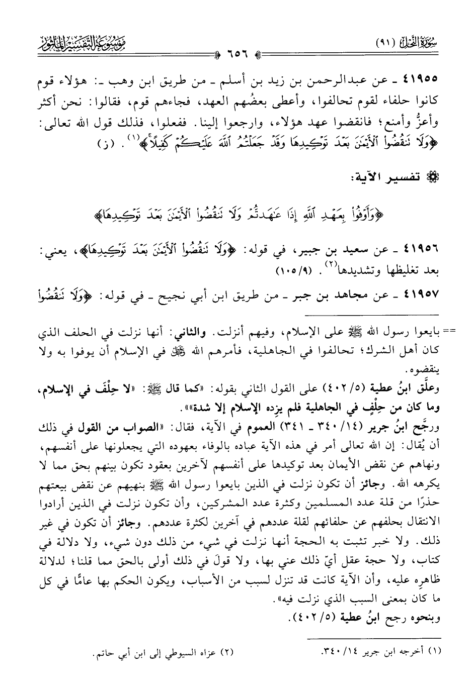 ٤١٩٥٥ - عن عبد الرحمن بن زيد بن أسلم -من طريق ابن وهب-: هؤلاء قوم كانوا حلفاء لقوم تحالفوا، وأعطى بعضُهم العهد، فجاءهم قوم، فقالوا: نحن أكثر وأعزُّ وأمنع؛ فانقضوا عهد هؤلاء، وارجعوا إلينا. ففعلوا، فذلك قول الله تعالى: {ولا تنقضوا الأيمان بعد توكيدها وقد جعلتم الله عليكم كفيلا} (¬١). (ز)