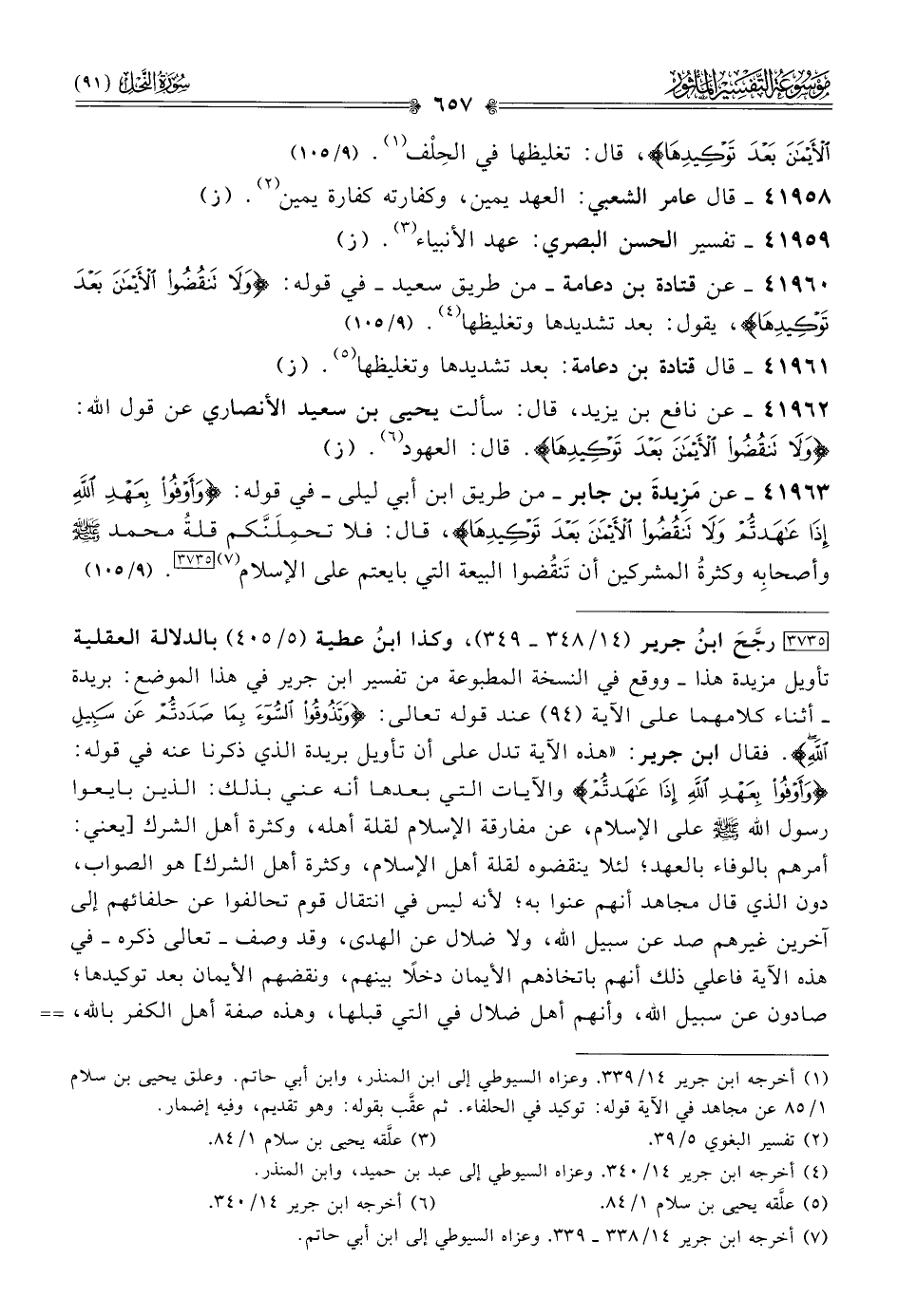 [٣٧٣٥] رجَّحَ ابنُ جرير (١٤/ ٣٤٨ - ٣٤٩)، وكذا ابنُ عطية (٥/ ٤٠٥) بالدلالة العقلية تأويل مزيدة هذا -ووقع في النسخة المطبوعة من تفسير ابن جرير في هذا الموضع: بريدة- أثناء كلامهما على الآية (٩٤) عند قوله تعالى: {وتَذُوقُوا السُّوءَ بِما صَدَدْتُمْ عَنْ سَبِيلِ اللَّهِ}. فقال ابن جرير: «هذه الآية تدل على أن تأويل بريدة الذي ذكرنا عنه في قوله: {وأوفوا بعهد الله إذا عاهدتم} والآيات التي بعدها أنه عني بذلك: الذين بايعوا رسول الله - صلى الله عليه وسلم - على الإسلام، عن مفارقة الإسلام لقلة أهله، وكثرة أهل الشرك [يعني: أمرهم بالوفاء بالعهد؛ لئلا ينقضوه لقلة أهل الإسلام، وكثرة أهل الشرك] هو الصواب، دون الذي قال مجاهد أنهم عنوا به؛ لأنه ليس في انتقال قوم تحالفوا عن حلفائهم إلى آخرين غيرهم صد عن سبيل الله، ولا ضلال عن الهدى، وقد وصف -تعالى ذكره- في هذه الآية فاعلي ذلك أنهم باتخاذهم الأيمان دخلًا بينهم، ونقضهم الأيمان بعد توكيدها؛ صادون عن سبيل الله، وأنهم أهل ضلال في التي قبلها، وهذه صفة أهل الكفر بالله، لا صفة أهل النقلة بالحلف عن قوم إلى قوم».