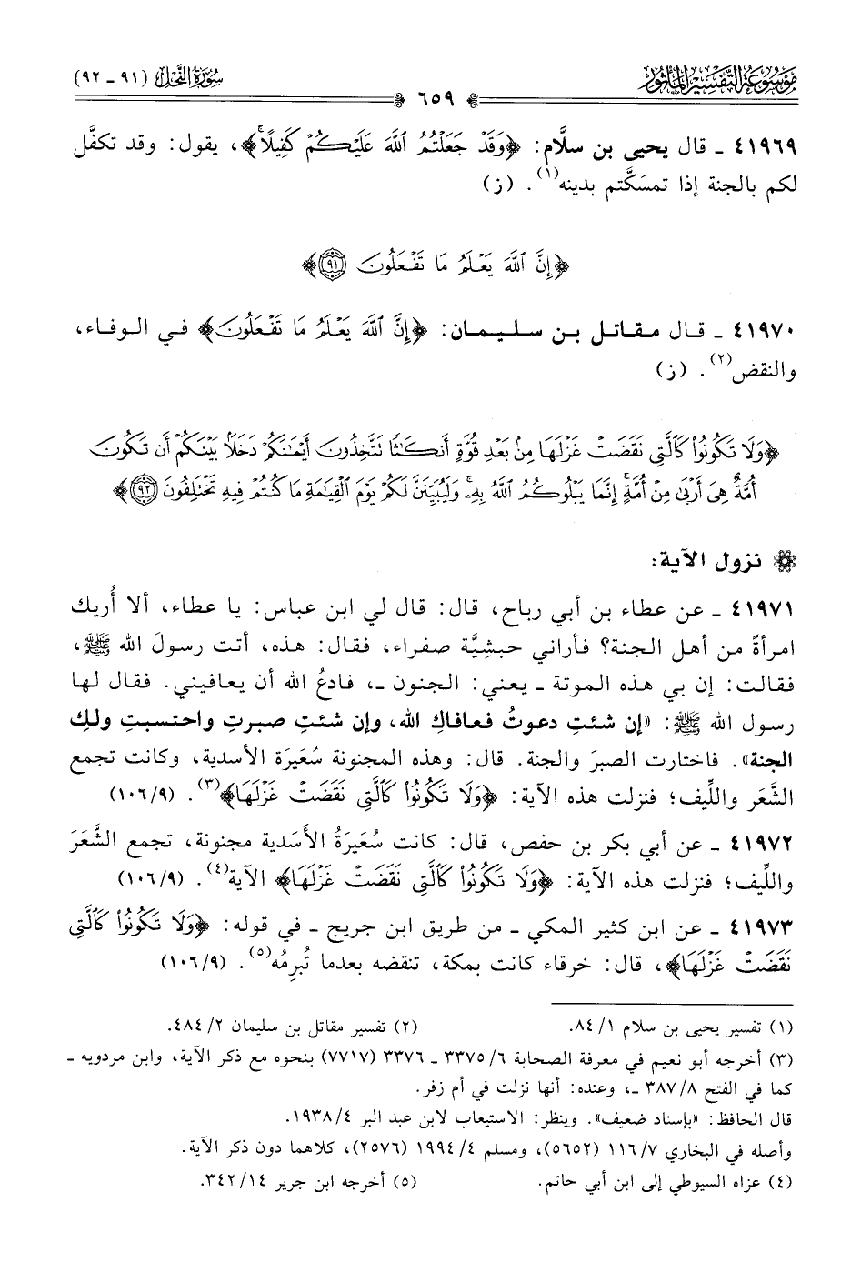٤١٩٧٢ - عن أبي بكر بن حفص، قال: كانت سُعَيرَةُ الأَسَدية مجنونة، تجمع الشَّعَرَ واللِّيف؛ فنزلت هذه الآية: {ولا تكونوا كالتي نقضت غزلها} الآية (¬٤). (٩/ ١٠٦)