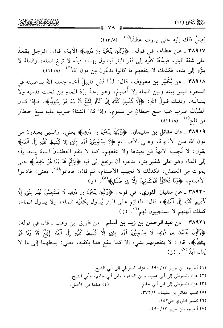 ٣٨٩٢٠ - عن سفيان الثوري، في قوله: {والذين يدعون من دونه لا يستجيبون لهم بشيء إلا كباسط كفيه الى الماء}، قال: القائِم على البئر يُناول بكفَّيْه الماء، ولا يناول الماء، كذلك آلهتهم لا يستجيبون لهم (¬٦). (ز)
