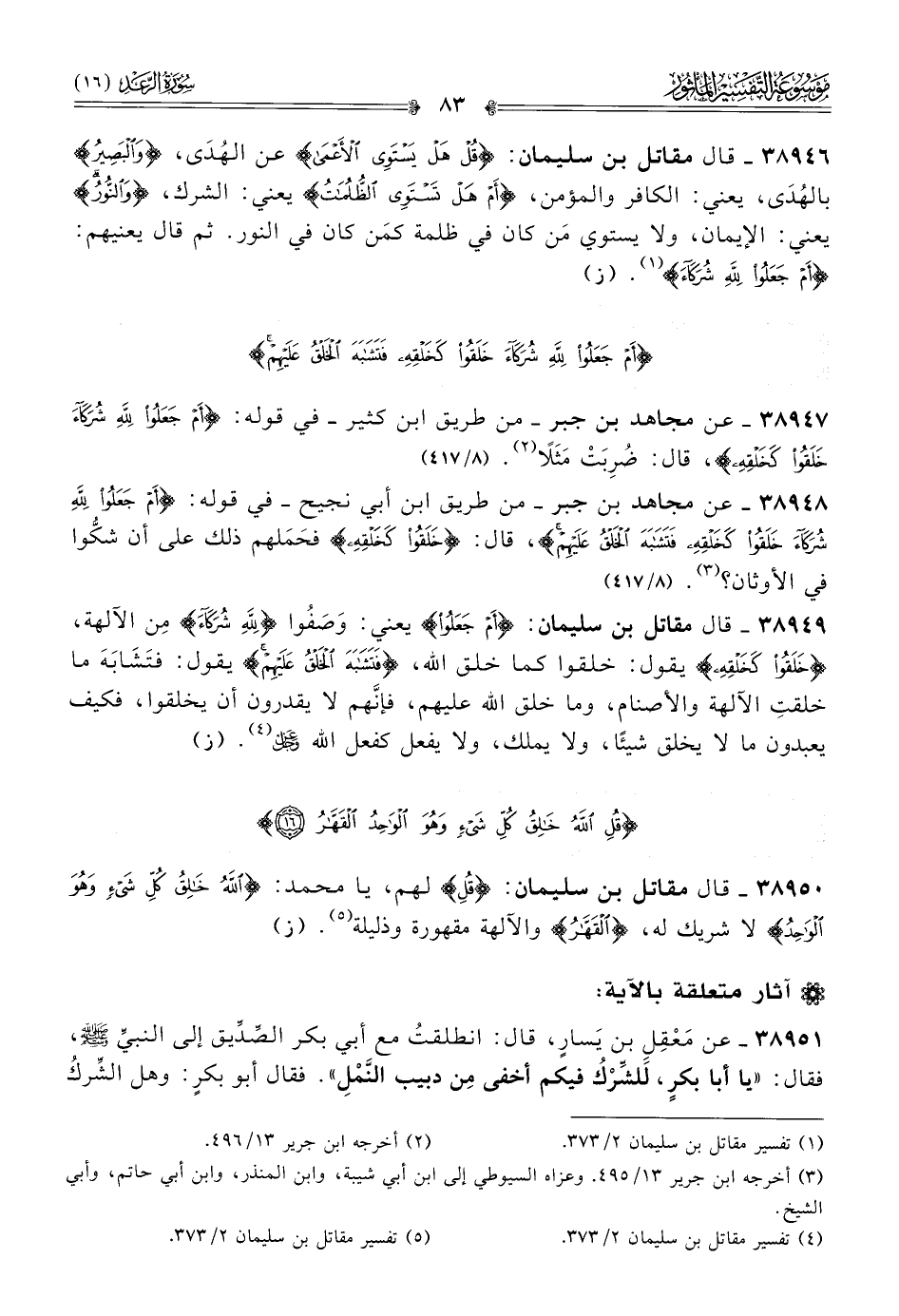 ٣٨٩٤٨ - عن مجاهد بن جبر -من طريق ابن أبي نجيح- في قوله: {أم جعلوا لله شُركاءَ خلقُوا كخلقِهِ فتشابه الخلقُ عليهم}، قال: {خلقوا كخلقه} فحَمَلهم ذلك على أن شكُّوا في الأوثان؟ (¬٣). (٨/ ٤١٧)