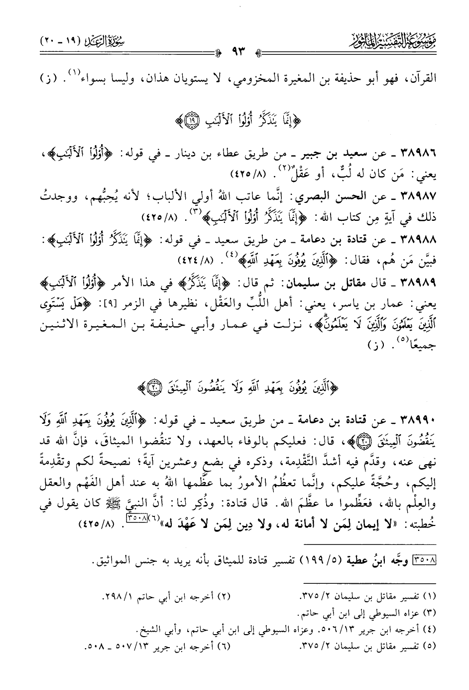 ٣٨٩٨٨ - عن قتادة بن دعامة -من طريق سعيد- في قوله: {إنّما يتذكَّر أولُوا الألبابِ}: فبيَّن مَن هُم، فقال: {الَّذين يُوفُون بعهدِ الله} (¬٤). (٨/ ٤٢٤)