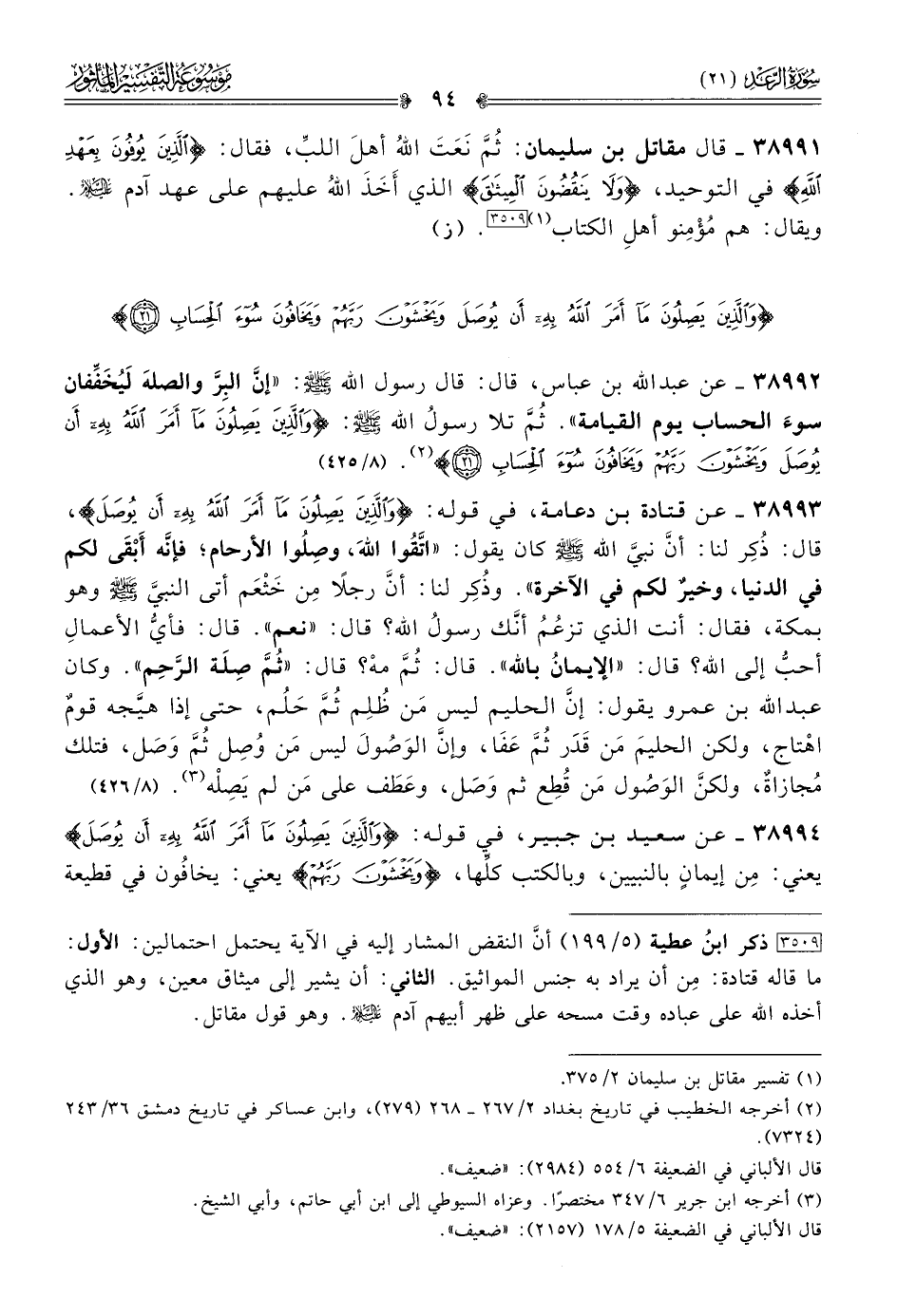 ٣٨٩٩٤ - عن سعيد بن جبير، في قوله: {والَّذين يصلُون ما أمر الله به أن يُوصل} يعني: مِن إيمانٍ بالنبيين، وبالكتب كلِّها، {ويخشونَ ربُهم} يعني: يخافُون في قطيعة