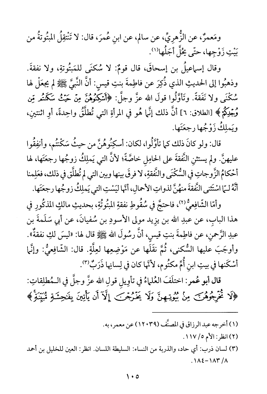 قال أبو عُمر: اختلَفَ العُلماءُ في تأوِيلِ قولِ الله عزَّ وجلَّ في المُطلِقاتِ: {لَا تُخْرِجُوهُنَّ مِنْ بُيُوتِهِنَّ وَلَا يَخْرُجْنَ إِلَّا أَنْ يَأْتِينَ بِفَاحِشَةٍ مُبَيِّنَةٍ}