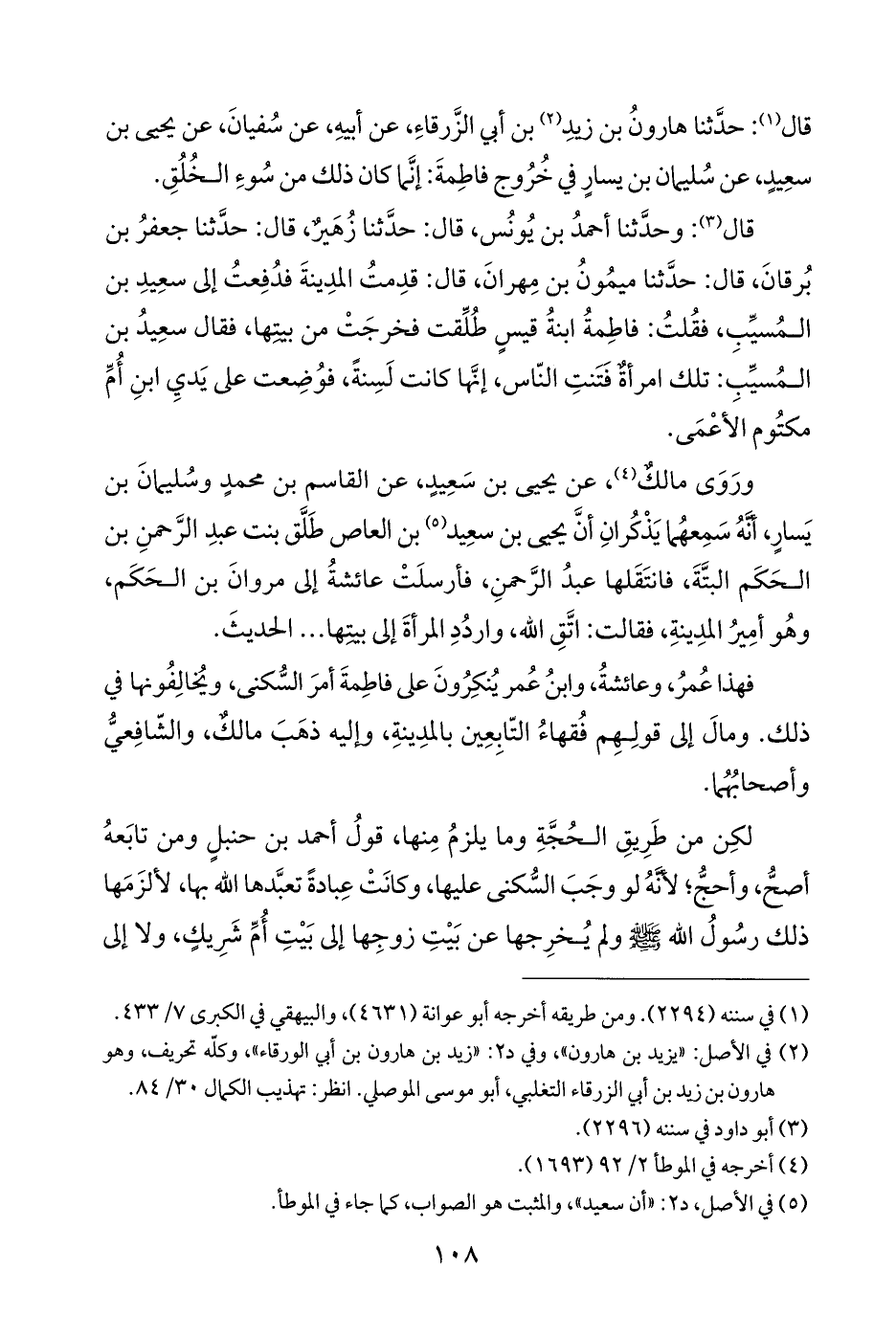 قال (¬١): حدَّثنا هارونُ بن زيدِ (¬٢) بن أبي الزَّرقاءِ، عن أبيهِ، عن سُفيانَ، عن يحيى بن سعِيدٍ، عن سُليمان بن يسارٍ في خُرُوج فاطِمةَ: إنَّما كان ذلك من سُوءِ الخُلُقِ.