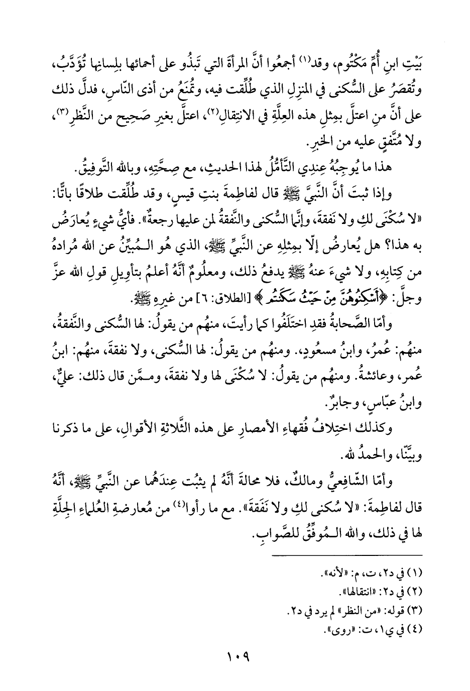 وإذا ثبتَ أنَّ النَّبيَّ - صلى الله عليه وسلم - قال لفاطِمةَ بنتِ قيسٍ، وقد طُلِّقت طلاقًا باتًّا: "لا سُكْنَى لكِ ولا نَفقةَ، وإنَّما السُّكنى والنَّفقةُ لمن عليها رجعة". فأيُّ شيءٍ يُعارَضُ به هذا؟ هل يُعارضُ إلّا بمِثلِهِ عن النَّبيِّ - صلى الله عليه وسلم -، الذي هُو المُبيِّنُ عن الله مُرادهُ من كِتابِهِ، ولا شيءَ عنهُ - صلى الله عليه وسلم - يدفعُ ذلك، ومعلُومٌ أنَّهُ أعلمُ بتأوِيلِ قولِ الله عزَّ وجلَّ: {أَسْكِنُوهُنَّ مِنْ حَيْثُ سَكَنْتُمْ} [الطلاق: ٦]، من غير غيرِهِ - صلى الله عليه وسلم -.