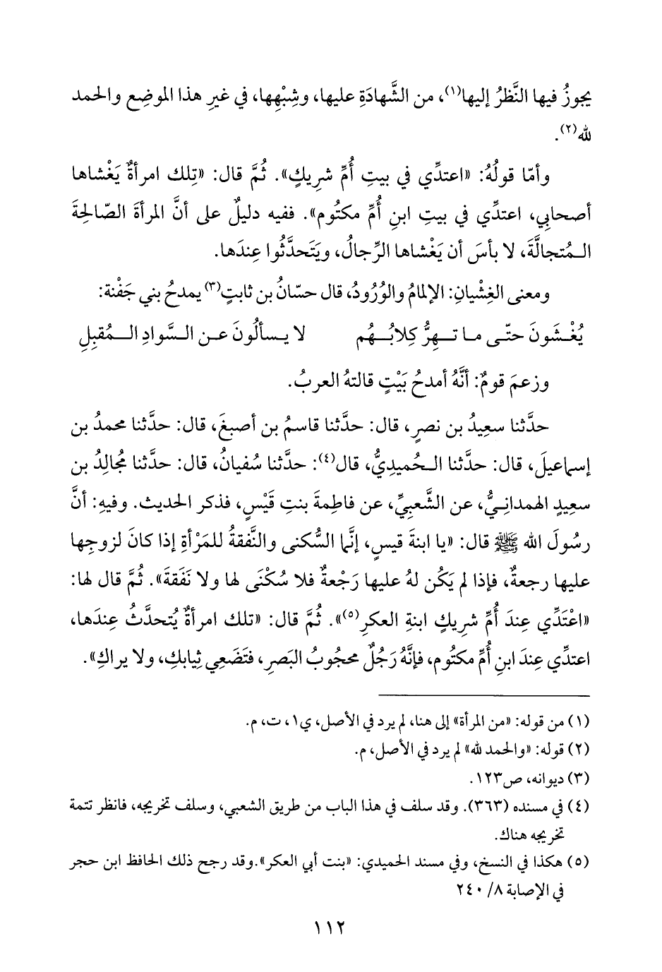 وأمّا قولُهُ: "اعتدِّي في بيتِ أُمِّ شرِيكٍ". ثُمَّ قال: "تِلك امرأةٌ يَغْشاها أصحابِي، اعتدِّي في بيتِ ابنِ أُمِّ مكتُوم". ففيه دليل على أنَّ المرأةَ الصّالحِةَ المُتجالَّةَ، لا بأسَ أن يَغْشاها الرِّجالُ، ويَتَحدَّثُوا عِندَها.